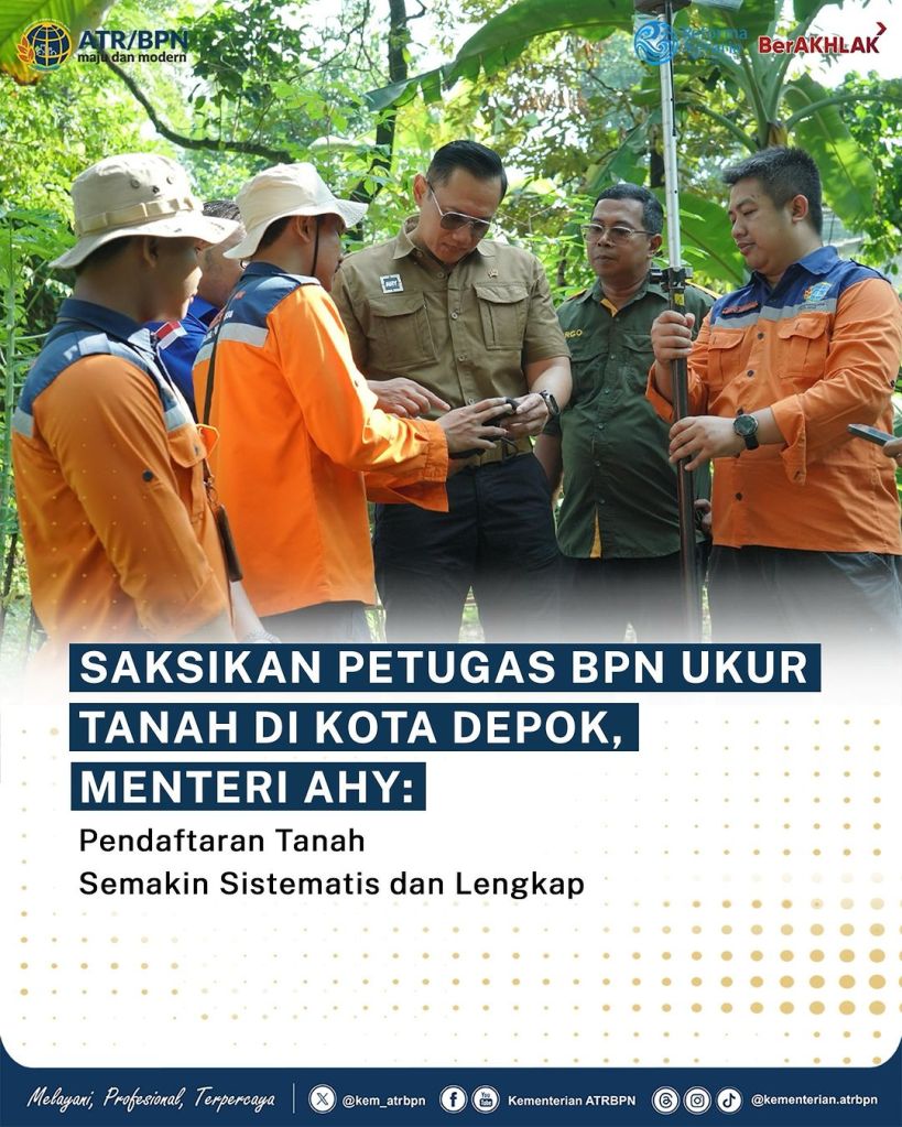 Menteri Agraria dan Tata Ruang/ Kepala Badan Pertanahan Nasional (ATR/BPN) Agus Harimurti Yudhoyono (AHY) menyaksikan langsung pengukuran tanah milik warga Depok. Pengukuran ini berlangsung di Kelurahan Cimpaeun, Kecamatan Tapos pada Kamis (06/06/2024).