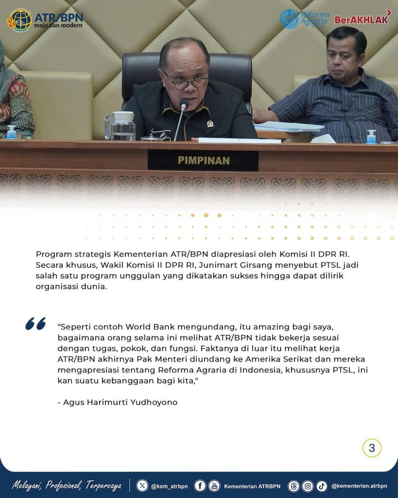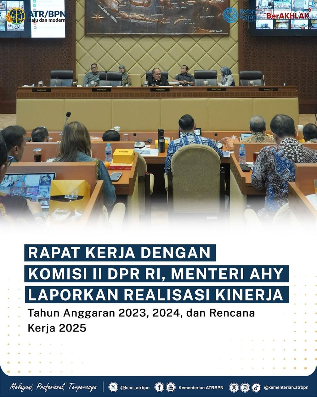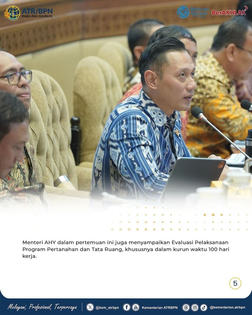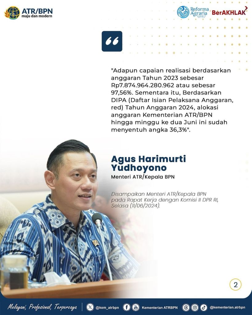Menteri Agraria dan Tata Ruang/Kepala Badan Pertanahan Nasional (ATR/BPN), Agus Harimurti Yudhoyono (AHY) menyampaikan realisasi kinerja Kementerian ATR/BPN pada Tahun Anggaran 2023, 2024, dan Rencana Kerja 2025.