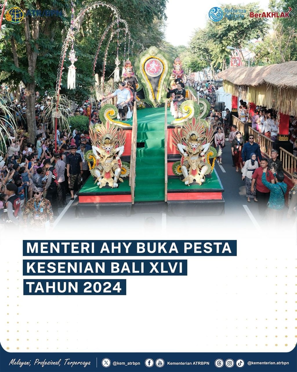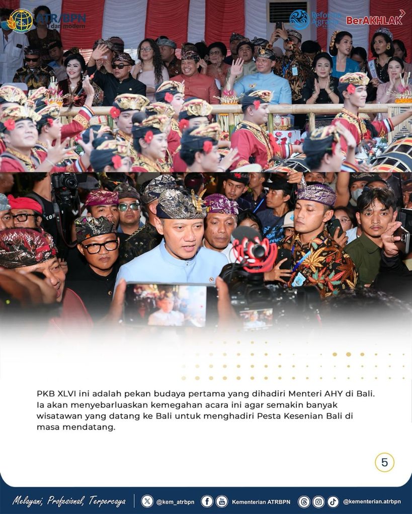 Menteri Agraria dan Tata Ruang/Kepala Badan Pertanahan Nasional (ATR/BPN), Agus Harimurti Yudhoyono (AHY) berkesempatan membuka Pesta Kesenian Bali (PKB) XLVI Tahun 2024 pada Sabtu (15/06/2024). Saat membuka acara, ia mengatakan bahwa PKB XLVI ini selaras dengan upaya mewujudkan Indonesia Emas 2045.