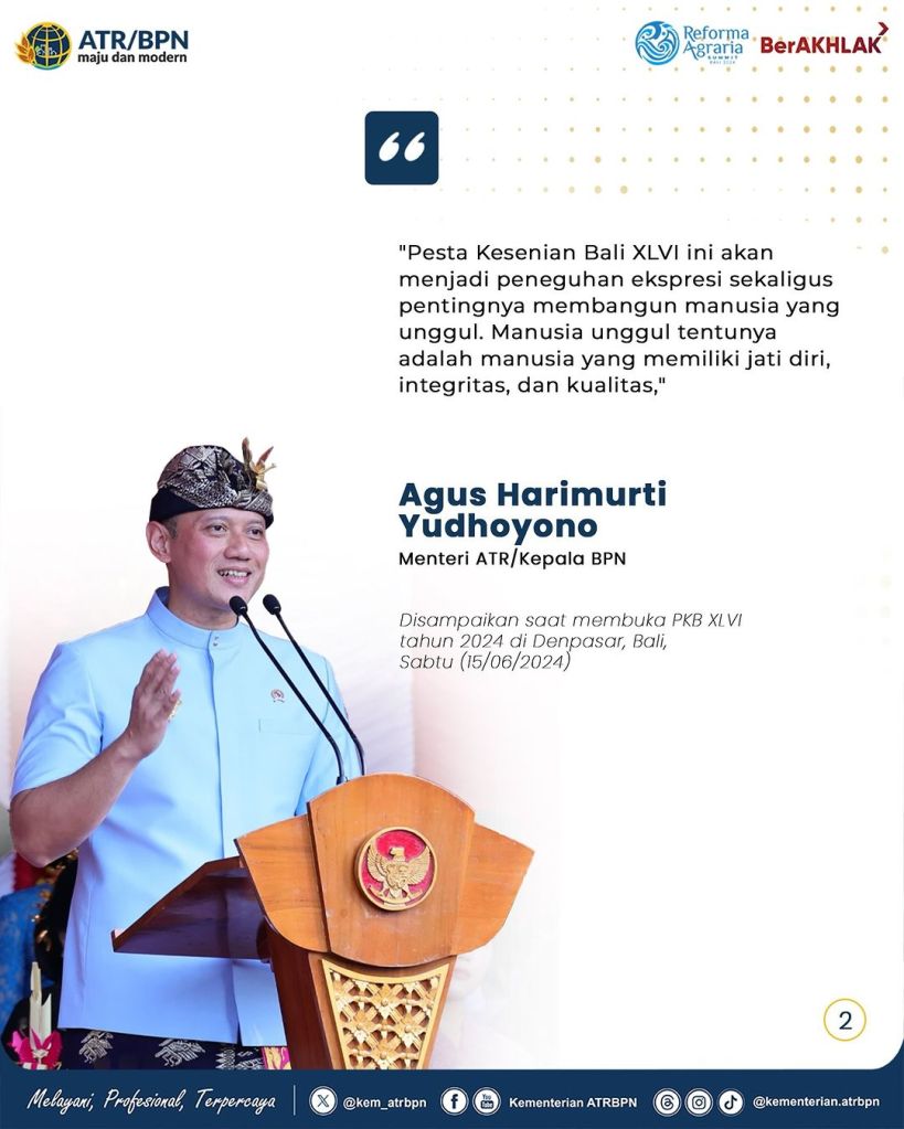 “Pesta Kesenian Bali XLVI ini akan menjadi peneguhan ekspresi sekaligus pentingnya membangun manusia yang unggul. Manusia unggul tentunya adalah manusia yang memiliki jati diri, integritas, dan kualitas,” kata Menteri ATR/Kepala BPN dalam sambutannya.