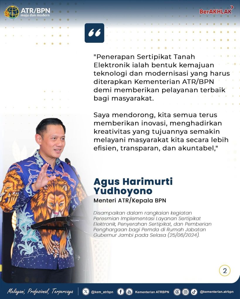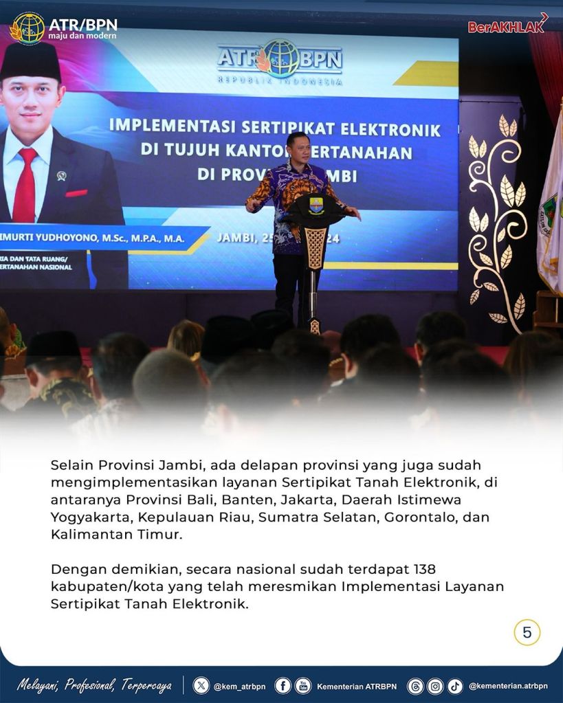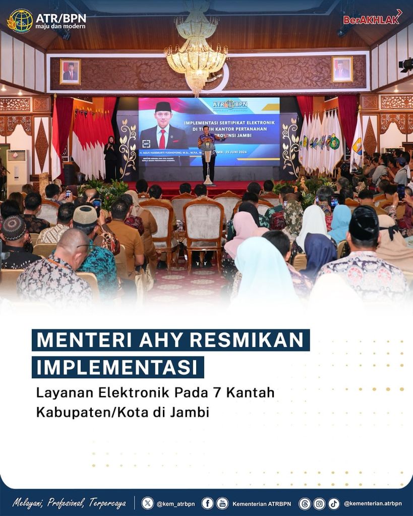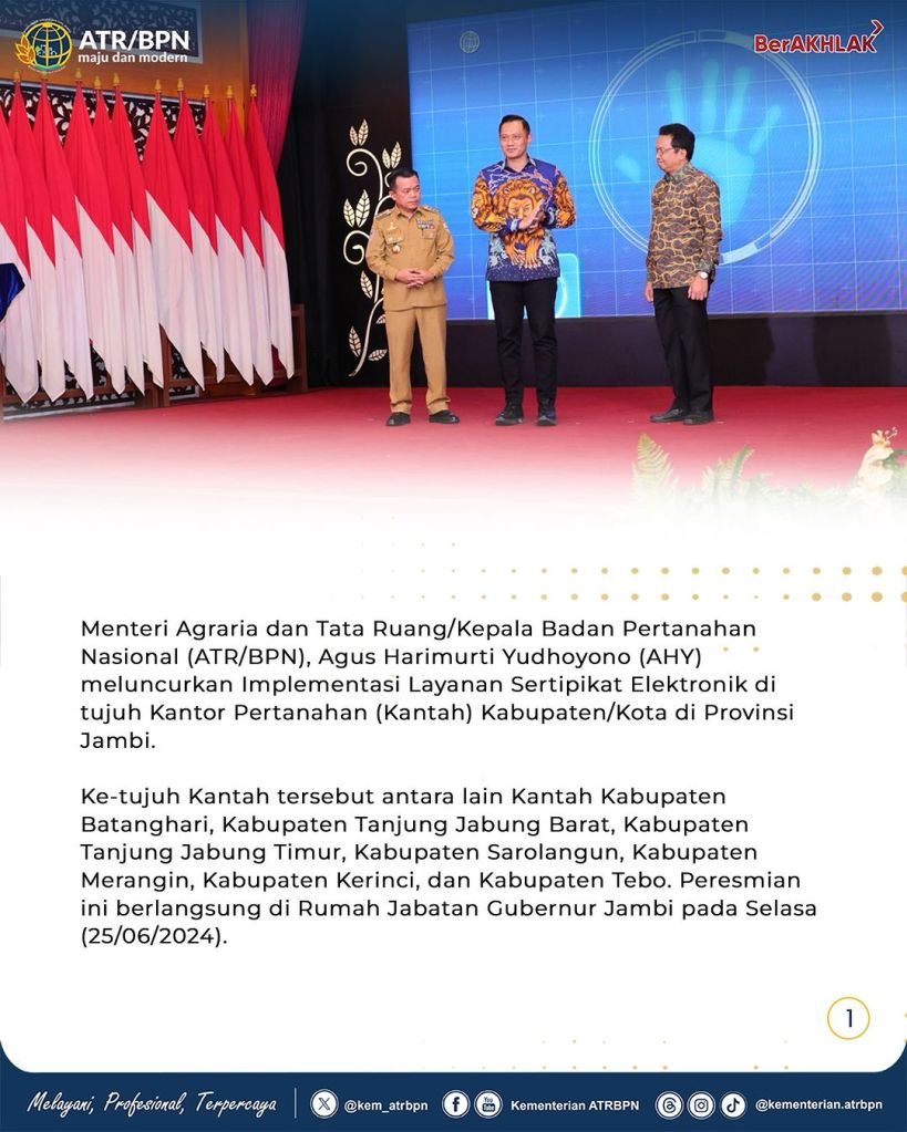 Menteri Agraria dan Tata Ruang/Kepala Badan Pertanahan Nasional (ATR/BPN), Agus Harimurti Yudhoyono (AHY) meluncurkan Implementasi Layanan Sertipikat Elektronik di tujuh Kantor Pertanahan (Kantah) Kabupaten/Kota di Provinsi Jambi. Ke-tujuh Kantah tersebut antara lain Kantah Kabupaten Batanghari, Kabupaten Tanjung Jabung Barat, Kabupaten Tanjung Jabung Timur, Kabupaten Sarolangun, Kabupaten Merangin, Kabupaten Kerinci, dan Kabupaten Tebo.