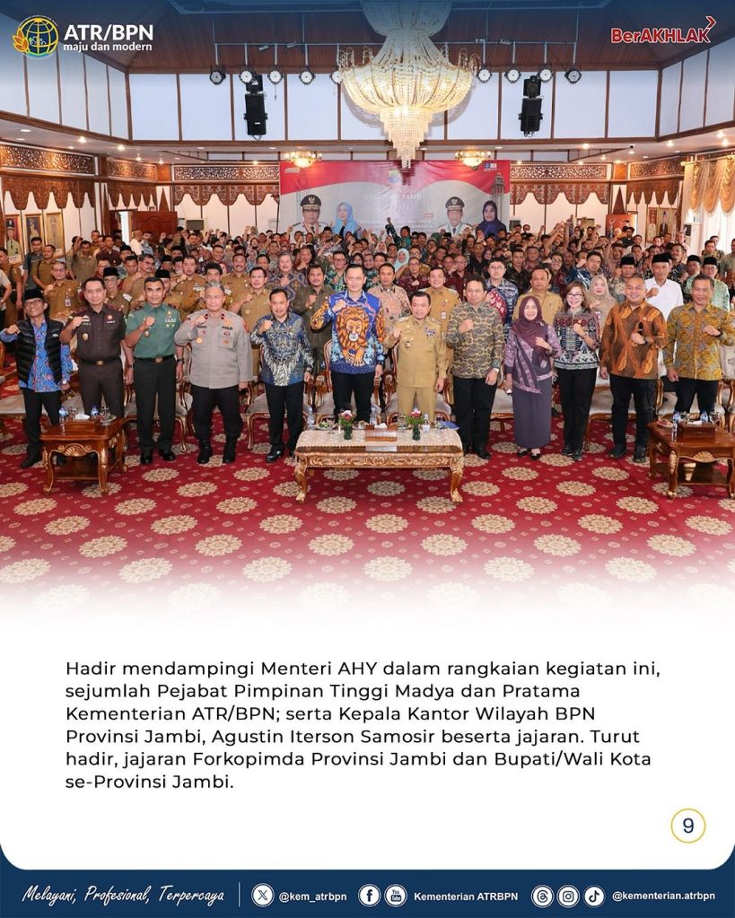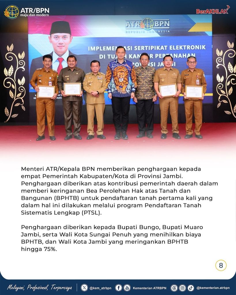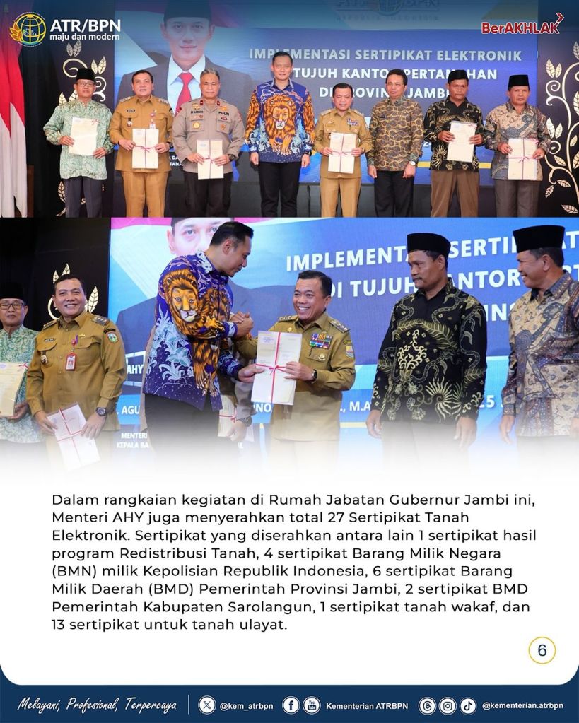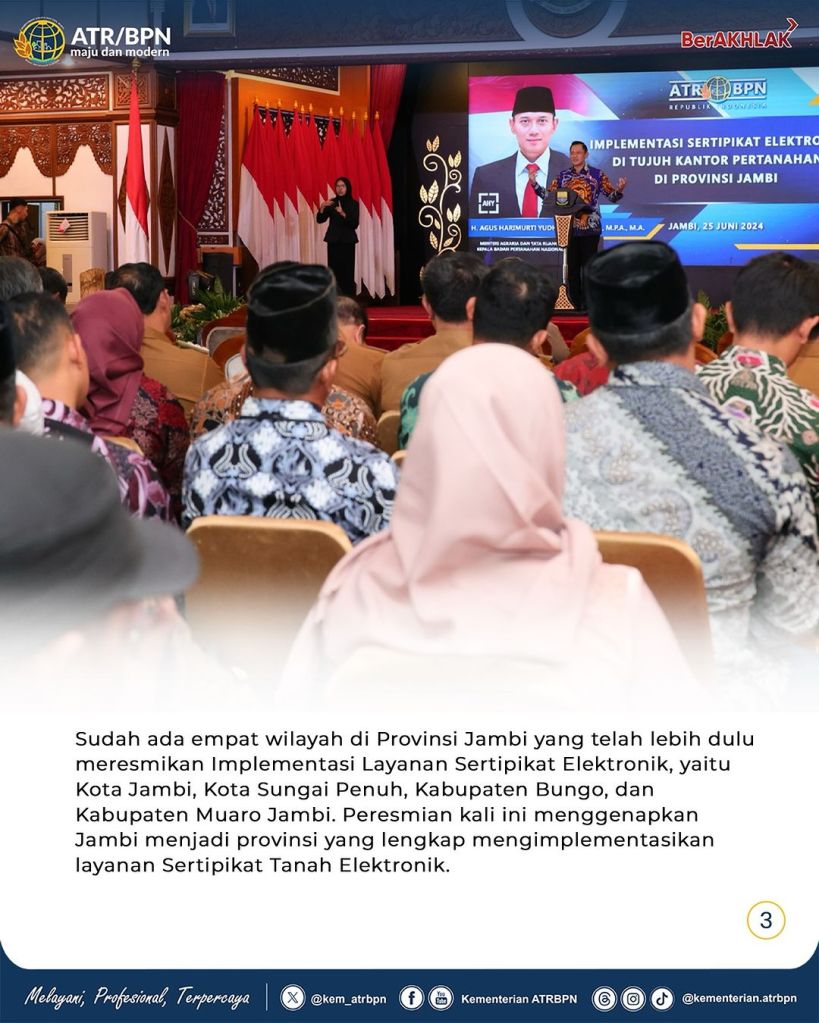 Menteri Agraria dan Tata Ruang/Kepala Badan Pertanahan Nasional (ATR/BPN), Agus Harimurti Yudhoyono (AHY) meluncurkan Implementasi Layanan Sertipikat Elektronik di tujuh Kantor Pertanahan (Kantah) Kabupaten/Kota di Provinsi Jambi. Ke-tujuh Kantah tersebut antara lain Kantah Kabupaten Batanghari, Kabupaten Tanjung Jabung Barat, Kabupaten Tanjung Jabung Timur, Kabupaten Sarolangun, Kabupaten Merangin, Kabupaten Kerinci, dan Kabupaten Tebo.