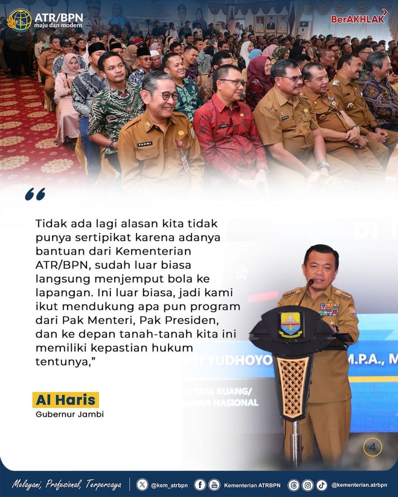 Dalam sambutannya, Menteri AHY menyatakan bahwa Implementasi Layanan Sertipikat Tanah Elektronik ini adalah bentuk komitmen menjalankan arahan Presiden Joko Widodo. “Semangat transformasi digital ini harus terus digalakkan dan menjadi bagian dari komitmen kita untuk melaksanakan arahan dari Bapak Presiden untuk memasifkan penerapan sertipikat elektronik,” jelas Menteri AHY di Rumah Jabatan Gubernur Jambi pada Selasa (25/06/2024).