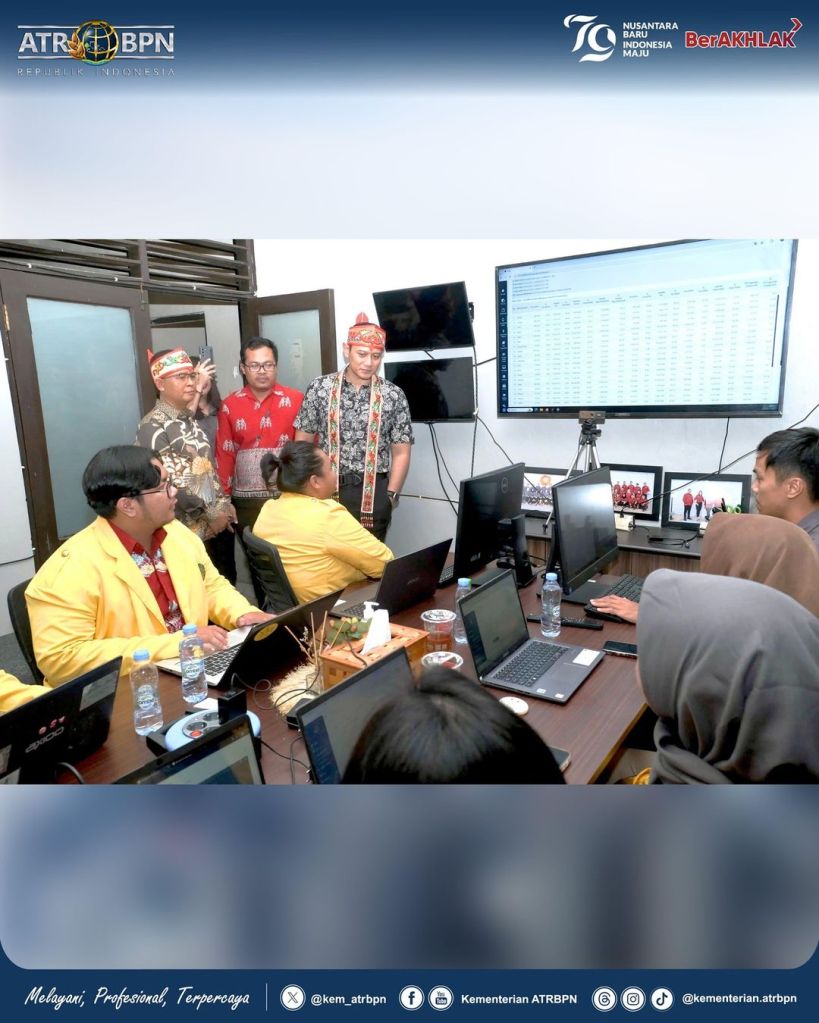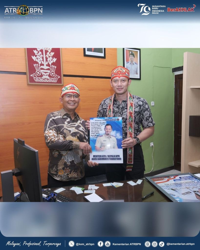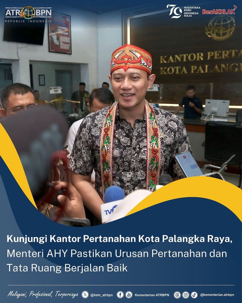 Mengawali kunjungan kerjanya di Provinsi Kalimantan Tengah, Menteri Agraria dan Tata Ruang/Kepala Badan Pertanahan Nasional (ATR/BPN), Agus Harimurti Yudhoyono (AHY) mengunjungi Kantor Pertanahan Kota Palangka Raya, Kamis (27/06/2024). Ia berkeliling meninjau seluruh ruangan dan menyapa jajaran kantor pertanahan.