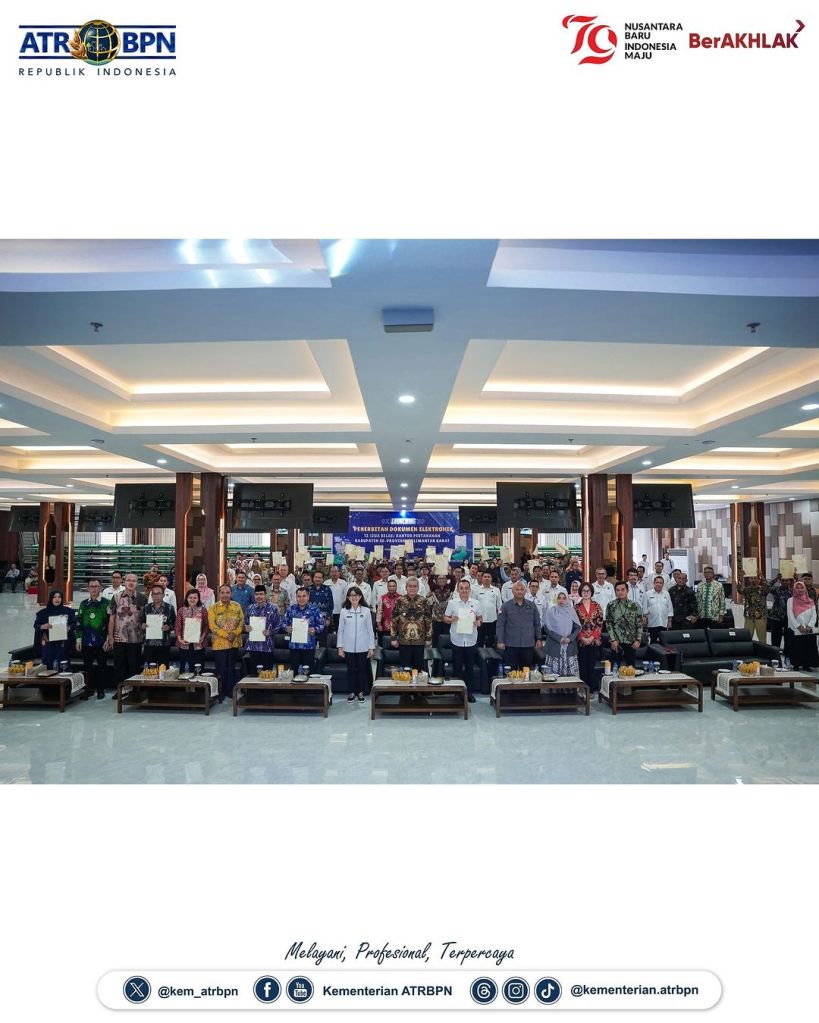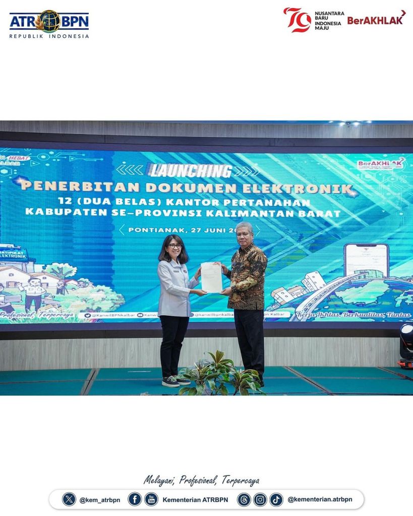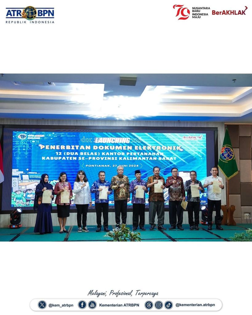 Sekretaris Jenderal (Sekjen) Kementerian ATR/BPN, Suyus Windayana meresmikan Implementasi Layanan Sertipikat Elektronik di 12 Kantor Pertanahan (Kantah) Kabupaten se-Provinsi Kalimantan Barat. Kegiatan ini berlangsung di Aula Garuda, Kantor Gubernur Kalimantan Barat, Kamis (27/06/2024).
