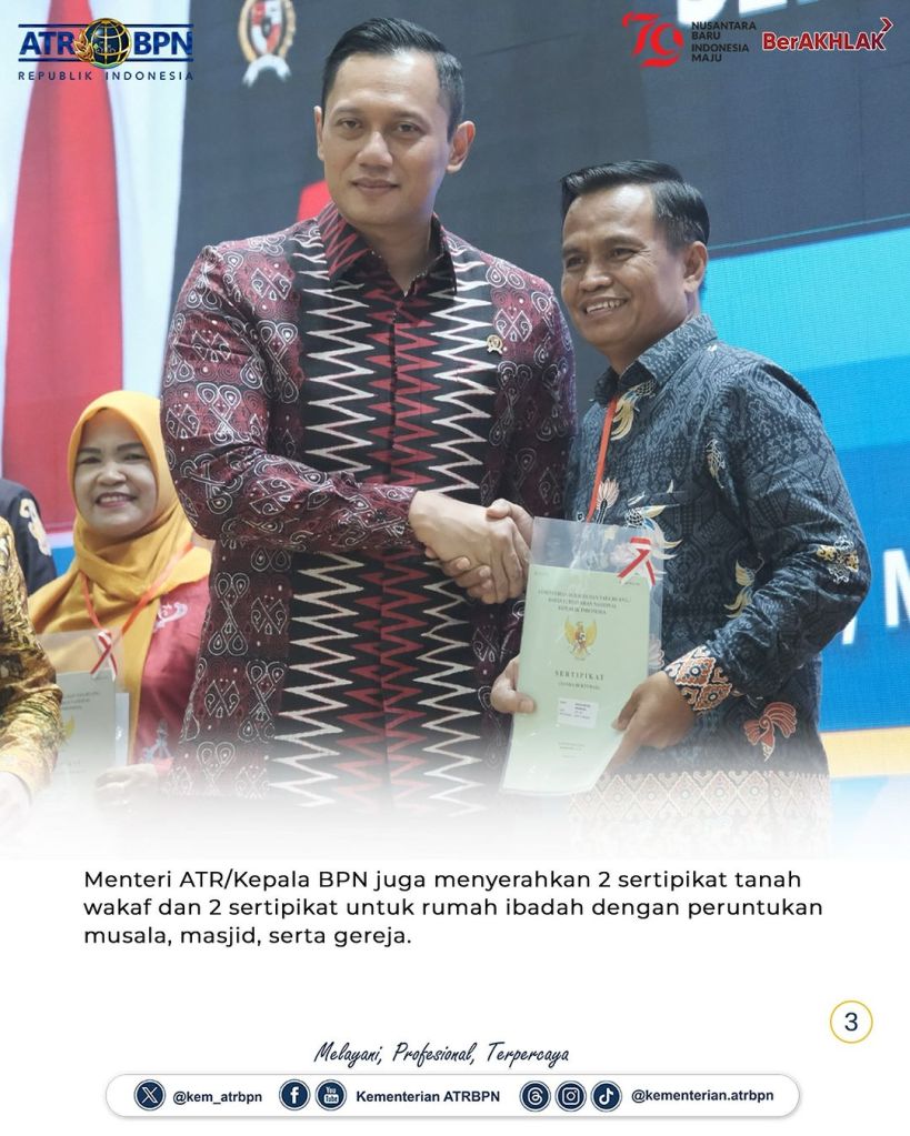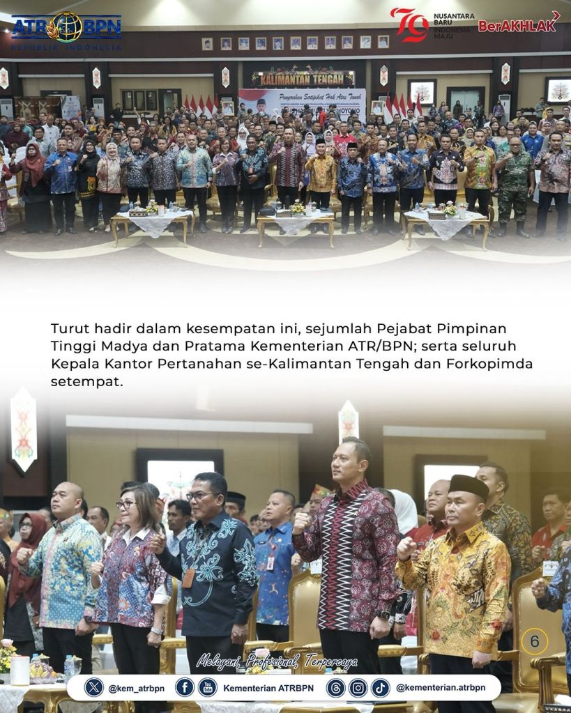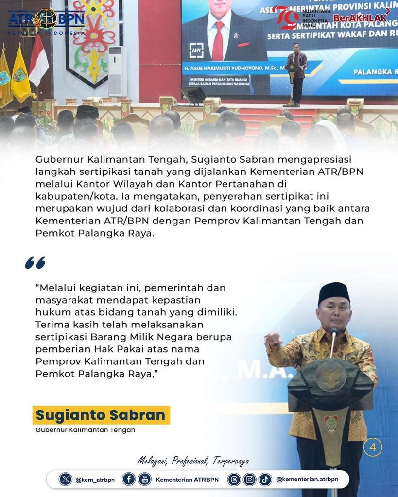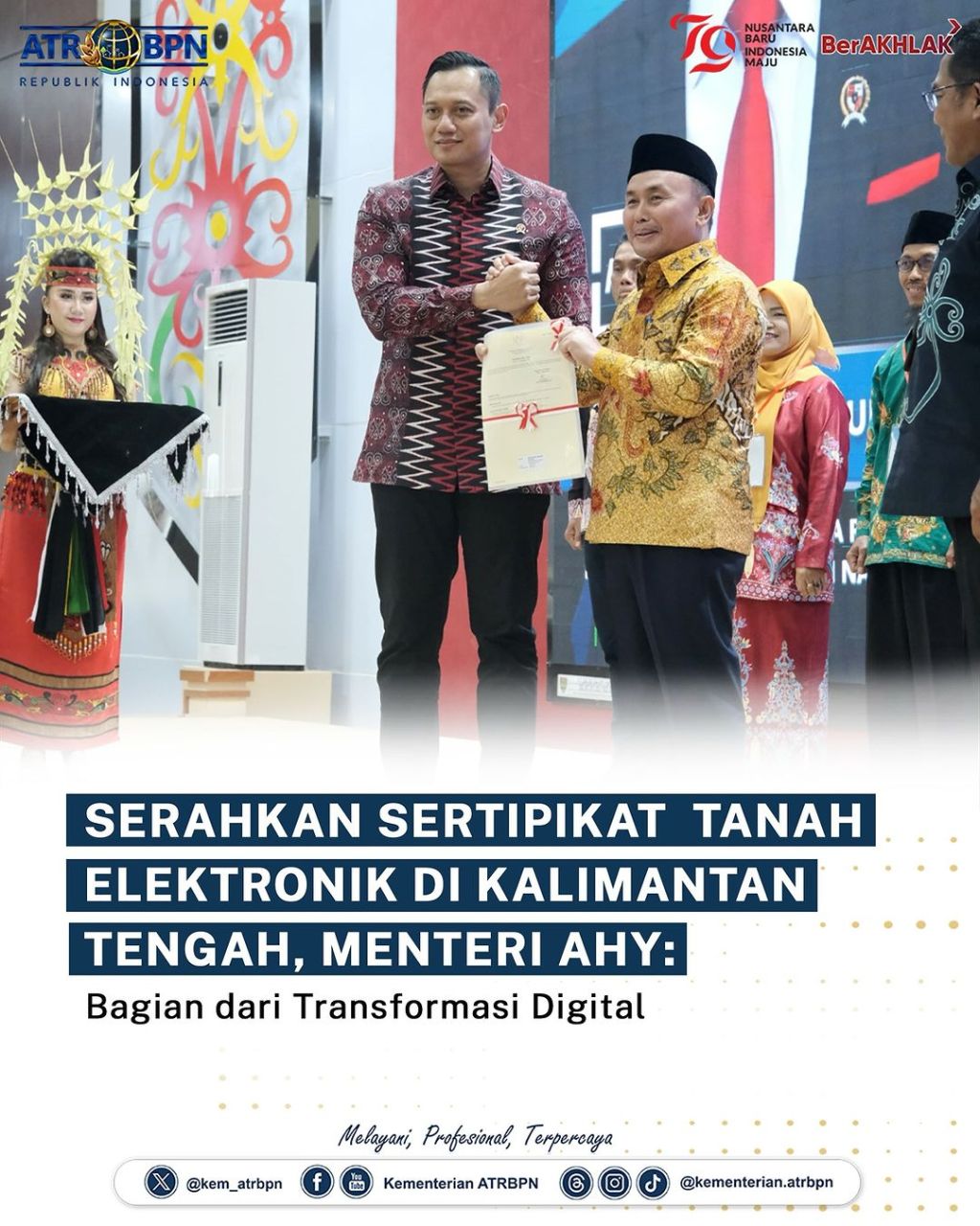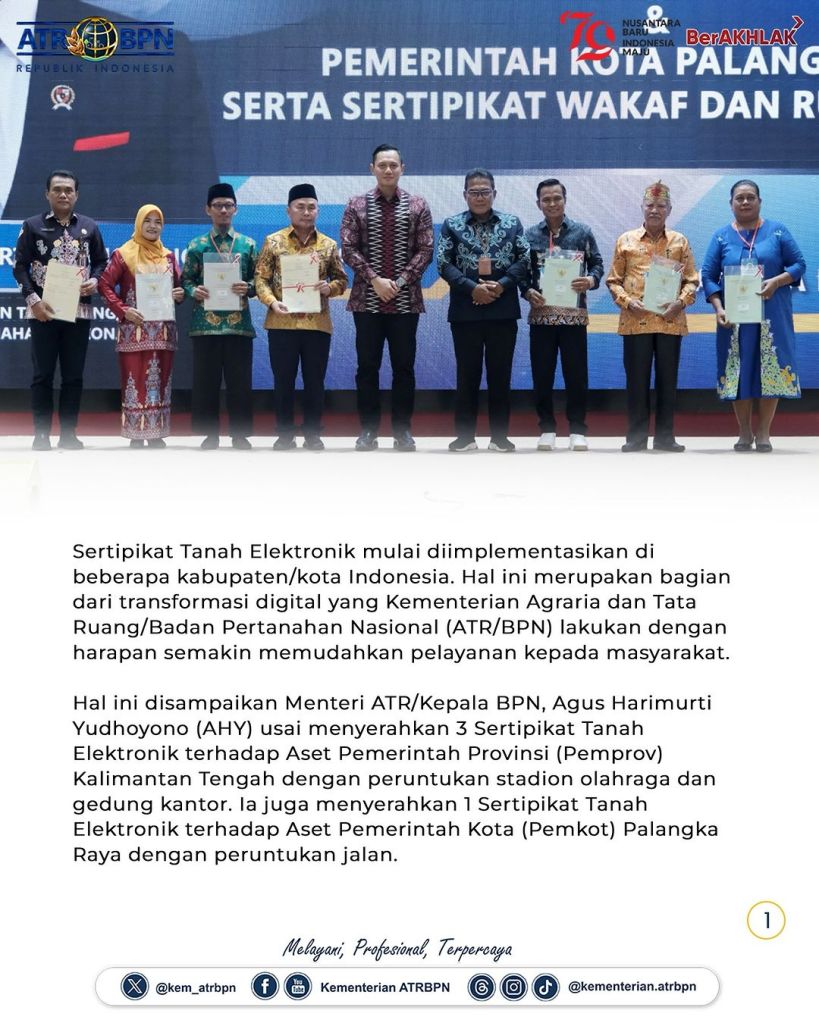 Hal ini disampaikan Menteri ATR/Kepala BPN, Agus Harimurti Yudhoyono (AHY) usai menyerahkan 3 Sertipikat Tanah Elektronik terhadap Aset Pemerintah Provinsi (Pemprov) Kalimantan Tengah dengan peruntukan stadion olahraga dan gedung kantor. Ia juga menyerahkan 1 Sertipikat Tanah Elektronik terhadap Aset Pemerintah Kota (Pemkot) Palangka Raya dengan peruntukan jalan.