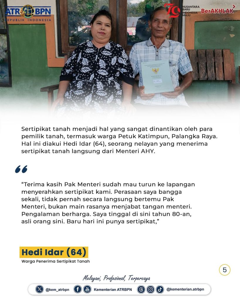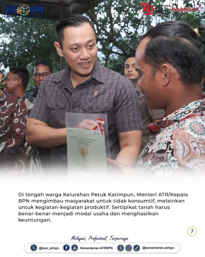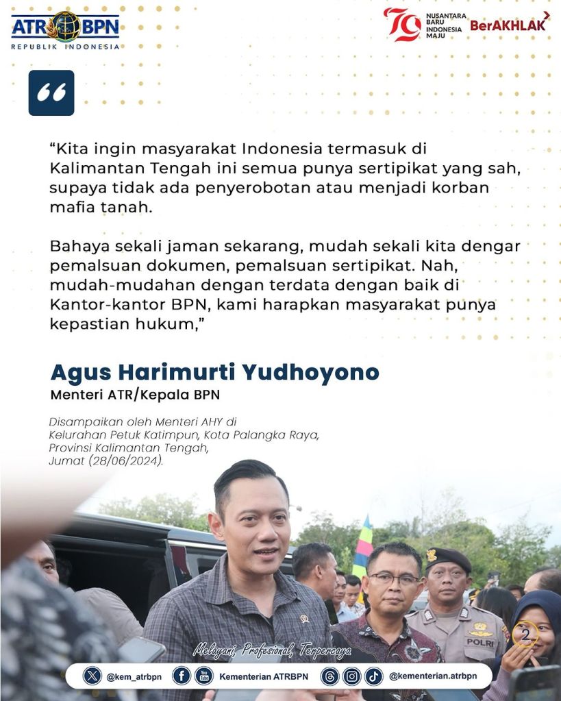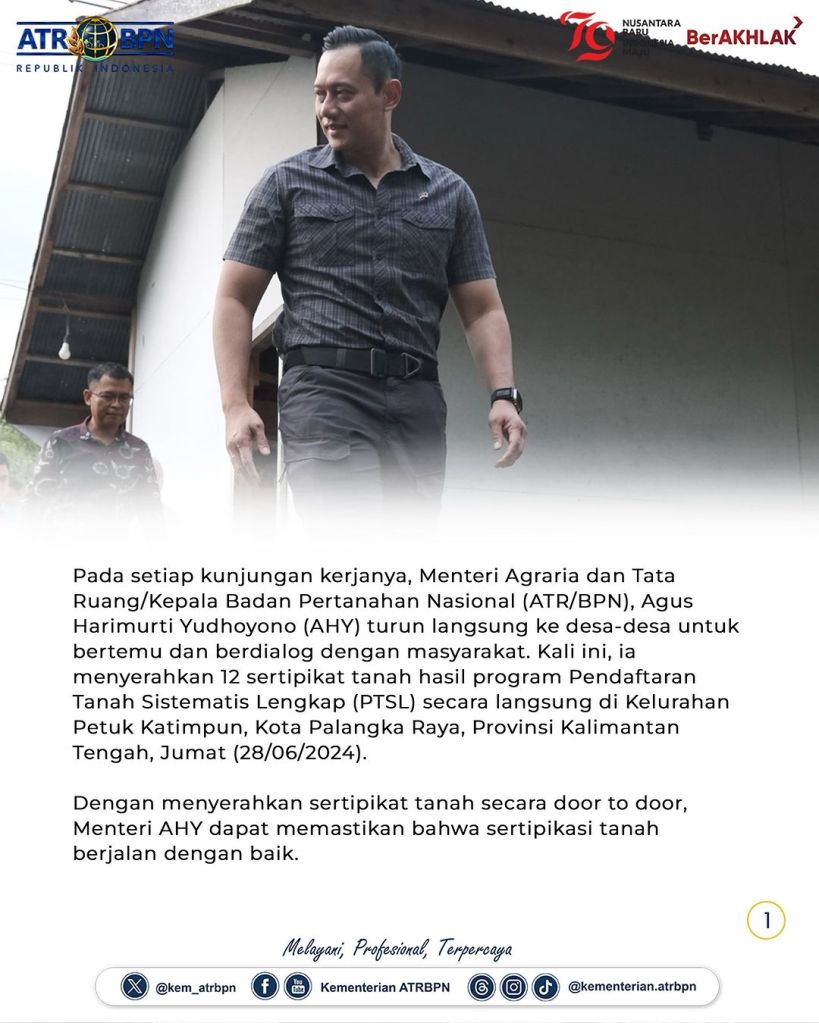 Pada setiap kunjungan kerjanya, Menteri Agraria dan Tata Ruang/Kepala Badan Pertanahan Nasional (ATR/BPN), Agus Harimurti Yudhoyono (AHY) turun langsung ke desa-desa untuk bertemu dan berdialog dengan masyarakat. Kali ini, ia menyerahkan 12 sertipikat tanah hasil program Pendaftaran Tanah Sistematis Lengkap (PTSL) secara langsung di Kelurahan Petuk Katimpun, Kota Palangka Raya, Jumat (28/06/2024).