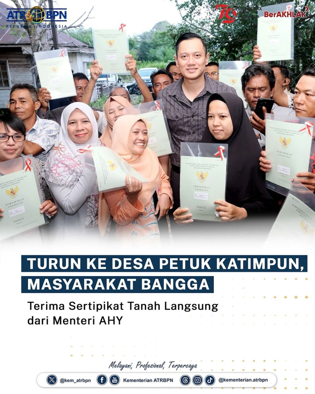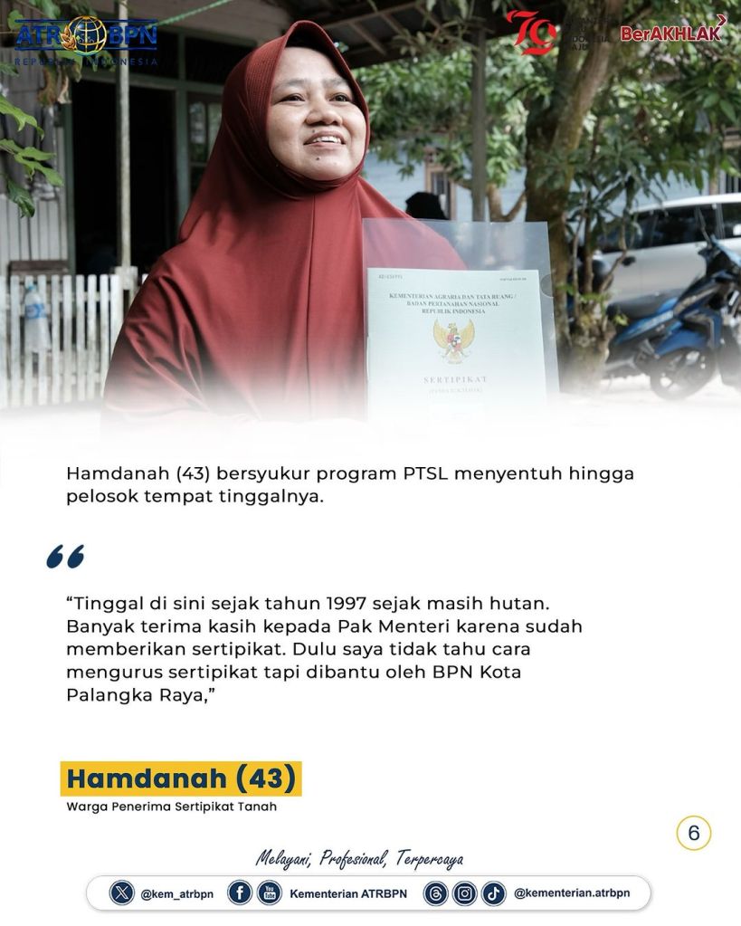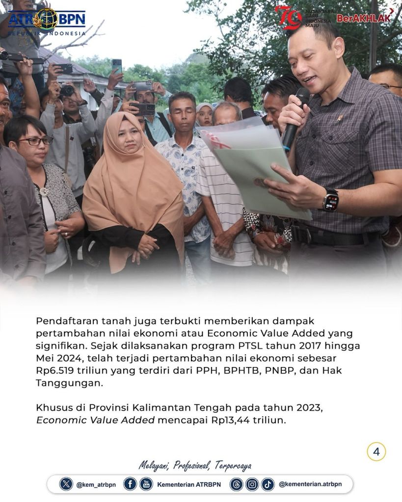 Pada setiap kunjungan kerjanya, Menteri Agraria dan Tata Ruang/Kepala Badan Pertanahan Nasional (ATR/BPN), Agus Harimurti Yudhoyono (AHY) turun langsung ke desa-desa untuk bertemu dan berdialog dengan masyarakat. Kali ini, ia menyerahkan 12 sertipikat tanah hasil program Pendaftaran Tanah Sistematis Lengkap (PTSL) secara langsung di Kelurahan Petuk Katimpun, Kota Palangka Raya, Jumat (28/06/2024).