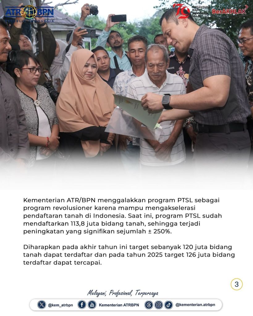 Dengan menyerahkan sertipikat tanah secara door to door, Menteri AHY dapat memastikan bahwa sertipikasi tanah berjalan dengan baik. “Ini sebagai upaya menyosialisasikan bahwa mengurus sertipikat itu mudah dan bisa dilakukan setiap saat, kapan pun, langsung tanpa harus ada perantara. Ini bagian dari program PTSL,” ujarnya.