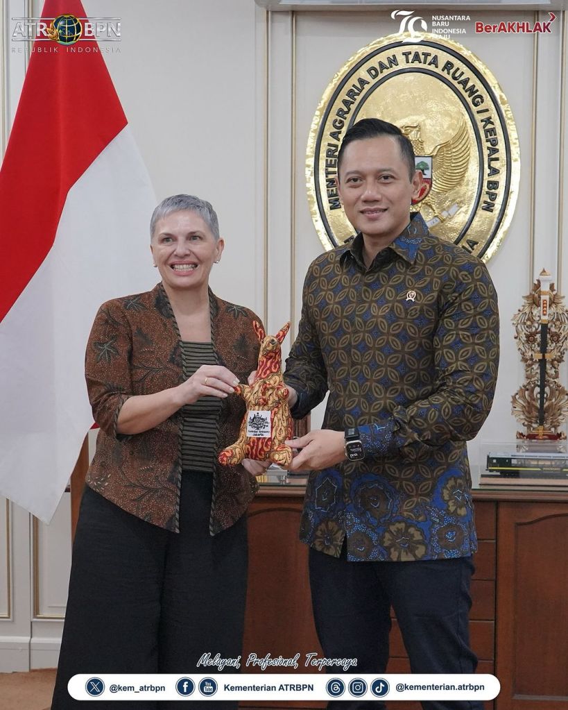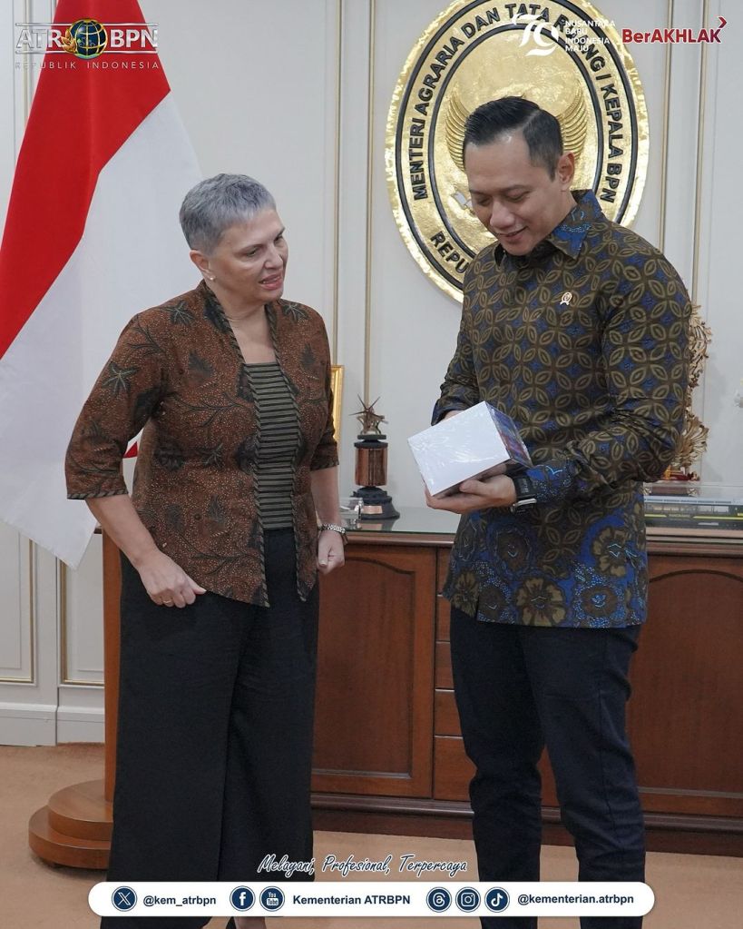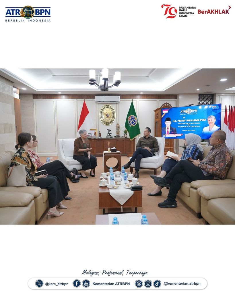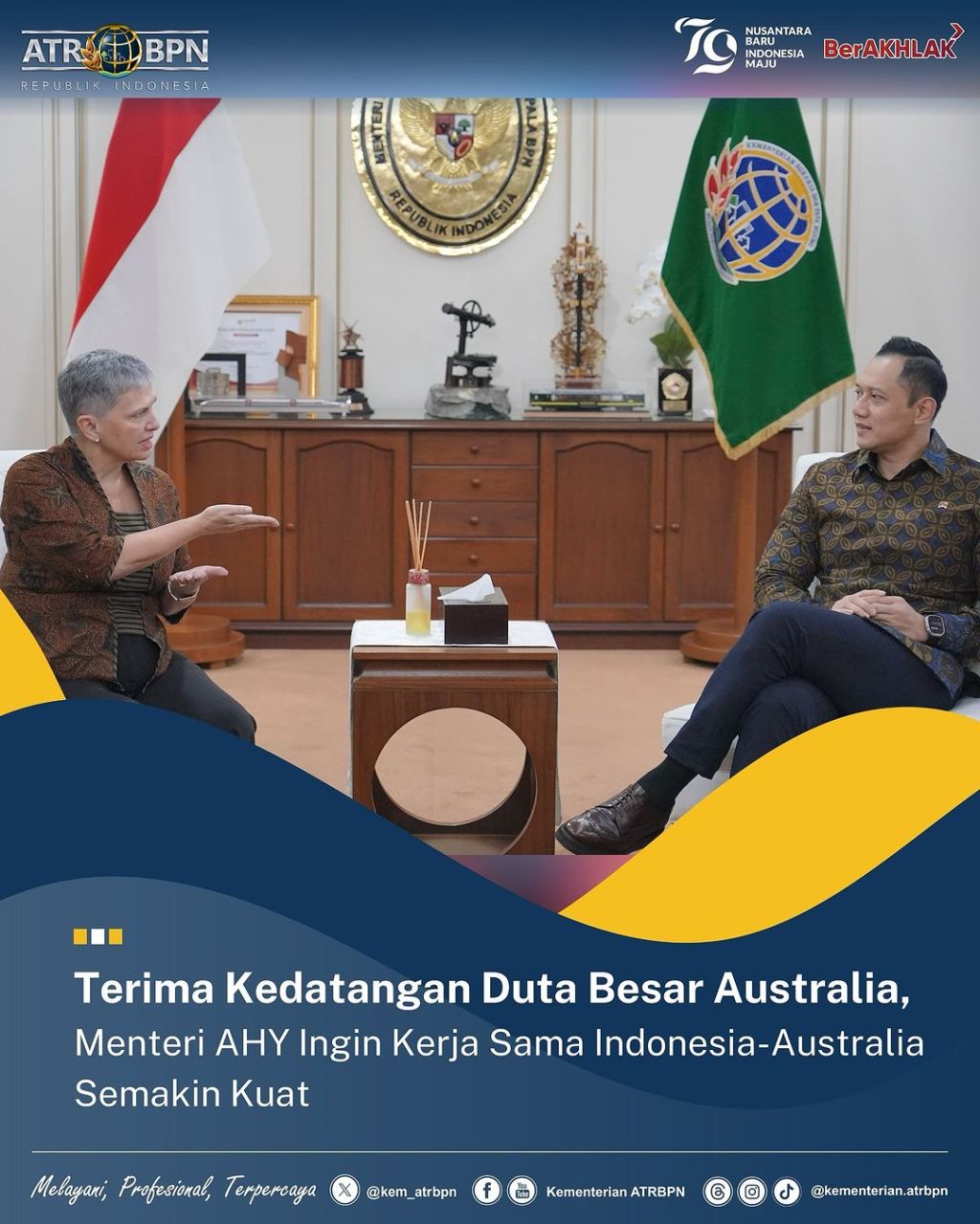 Menteri Agraria dan Tata Ruang/Kepala Badan Pertanahan Nasional (ATR/BPN), Agus Harimurti Yudhoyono (AHY) membicarakan bagaimana cara memperkuat kerja sama Indonesia-Australia yang sudah terjalin selama ini dengan Duta Besar Australia untuk Indonesia, Penny Williams.