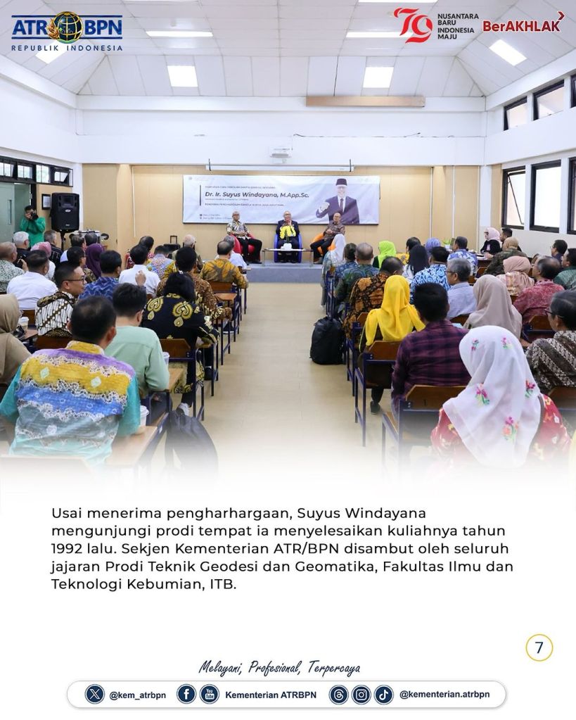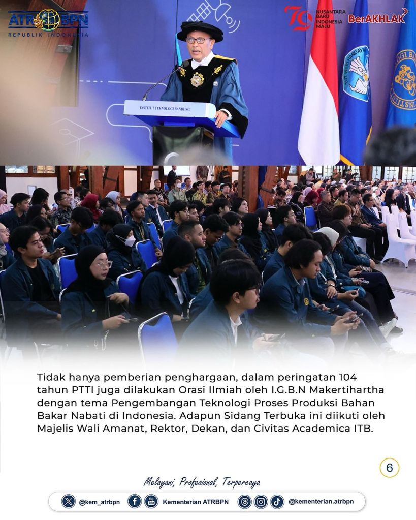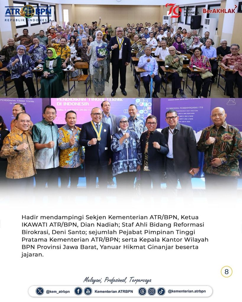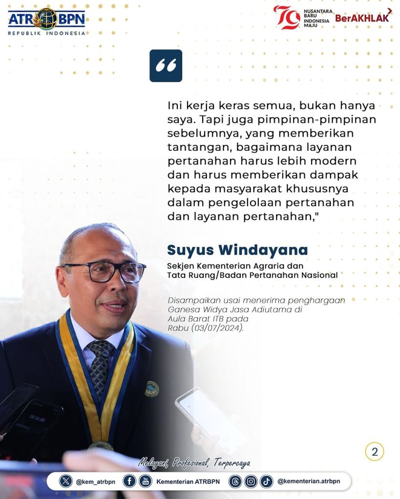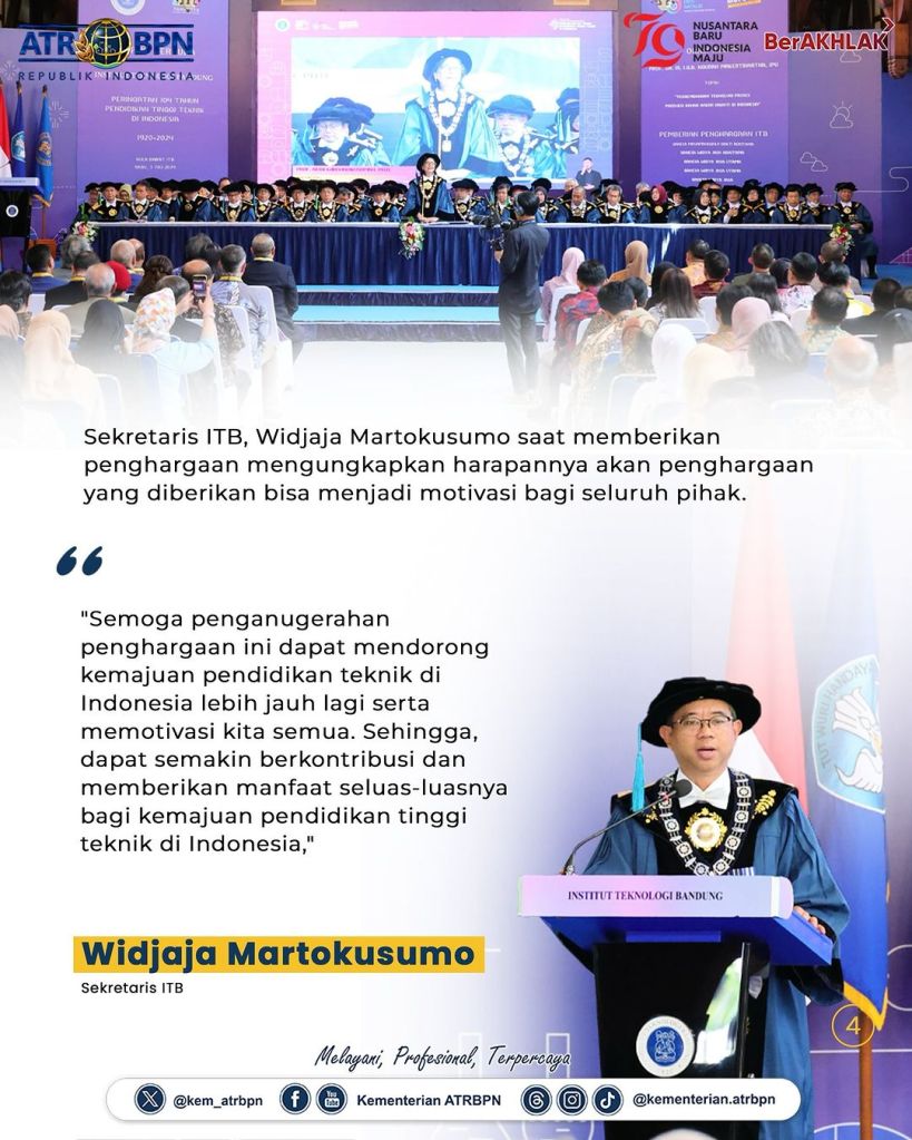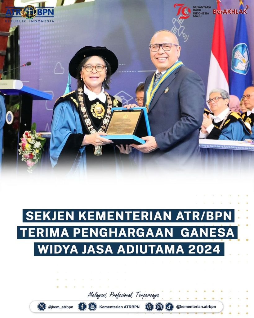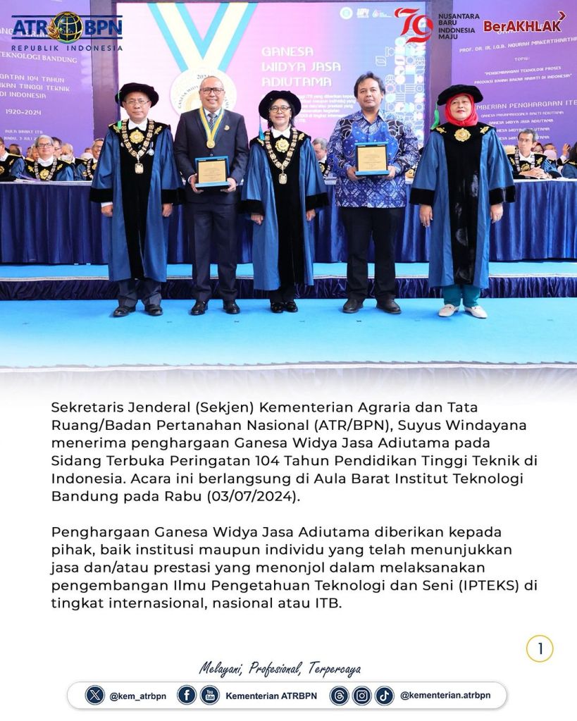 Sekretaris Jenderal (Sekjen) Kementerian Agraria dan Tata Ruang/Badan Pertanahan Nasional (ATR/BPN), Suyus Windayana menerima penghargaan Ganesa Widya Jasa Adiutama pada Sidang Terbuka Peringatan 104 Tahun Pendidikan Tinggi Teknik di Indonesia. Acara ini berlangsung di Aula Barat Institut Teknologi Bandung pada Rabu (03/07/2024).