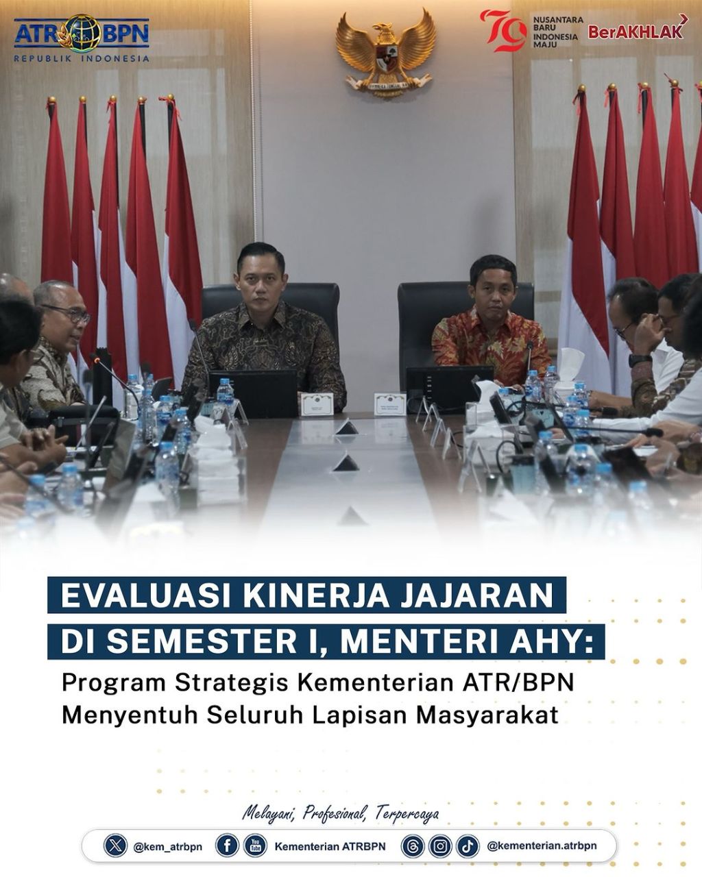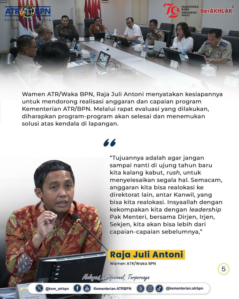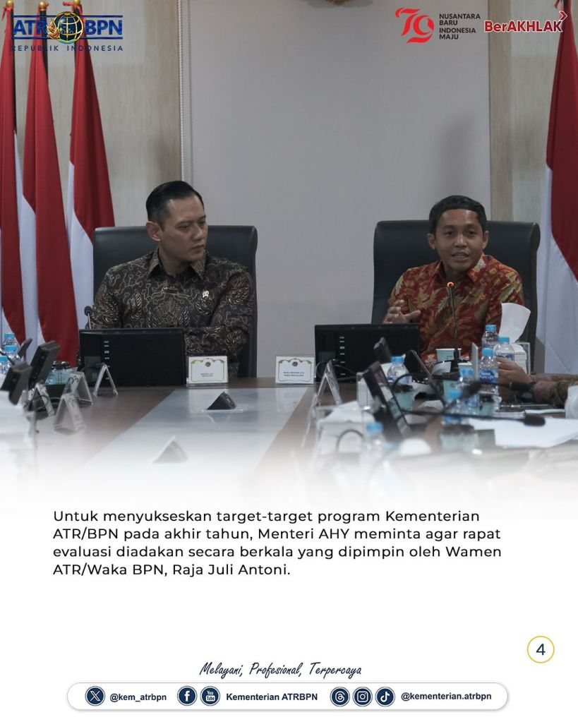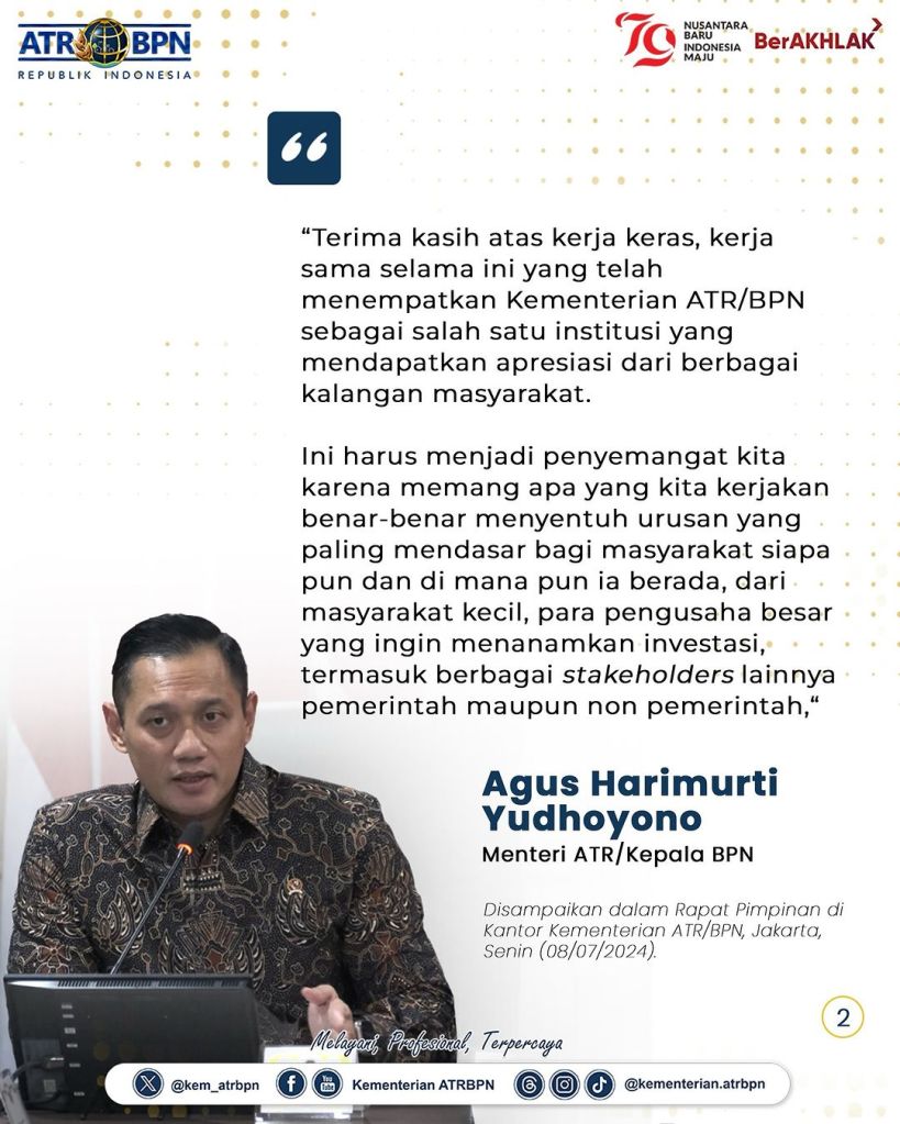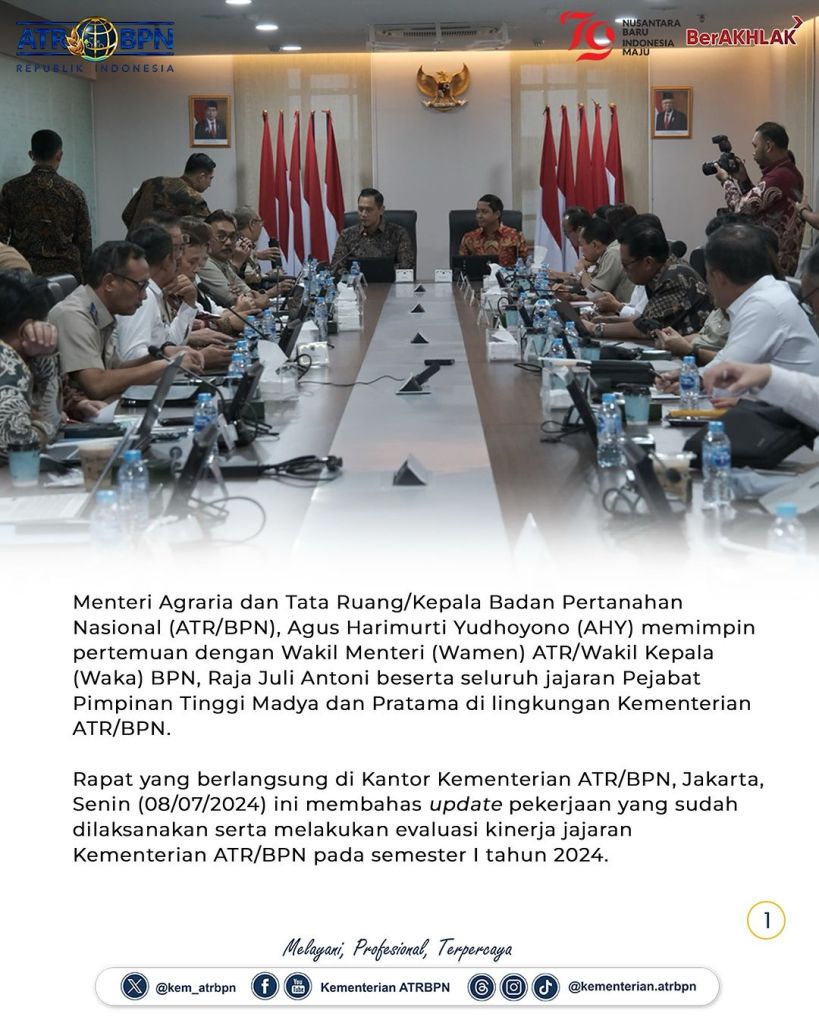 Menteri Agraria dan Tata Ruang/Kepala Badan Pertanahan Nasional (ATR/BPN), Agus Harimurti Yudhoyono (AHY) memimpin pertemuan dengan Wakil Menteri (Wamen) ATR/Wakil Kepala (Waka) BPN, Raja Juli Antoni beserta seluruh jajaran Pejabat Pimpinan Tinggi Madya dan Pratama di lingkungan Kementerian ATR/BPN. Rapat pimpinan ini berlangsung di Kantor Kementerian ATR/BPN, Jakarta, Senin (08/07/2024).