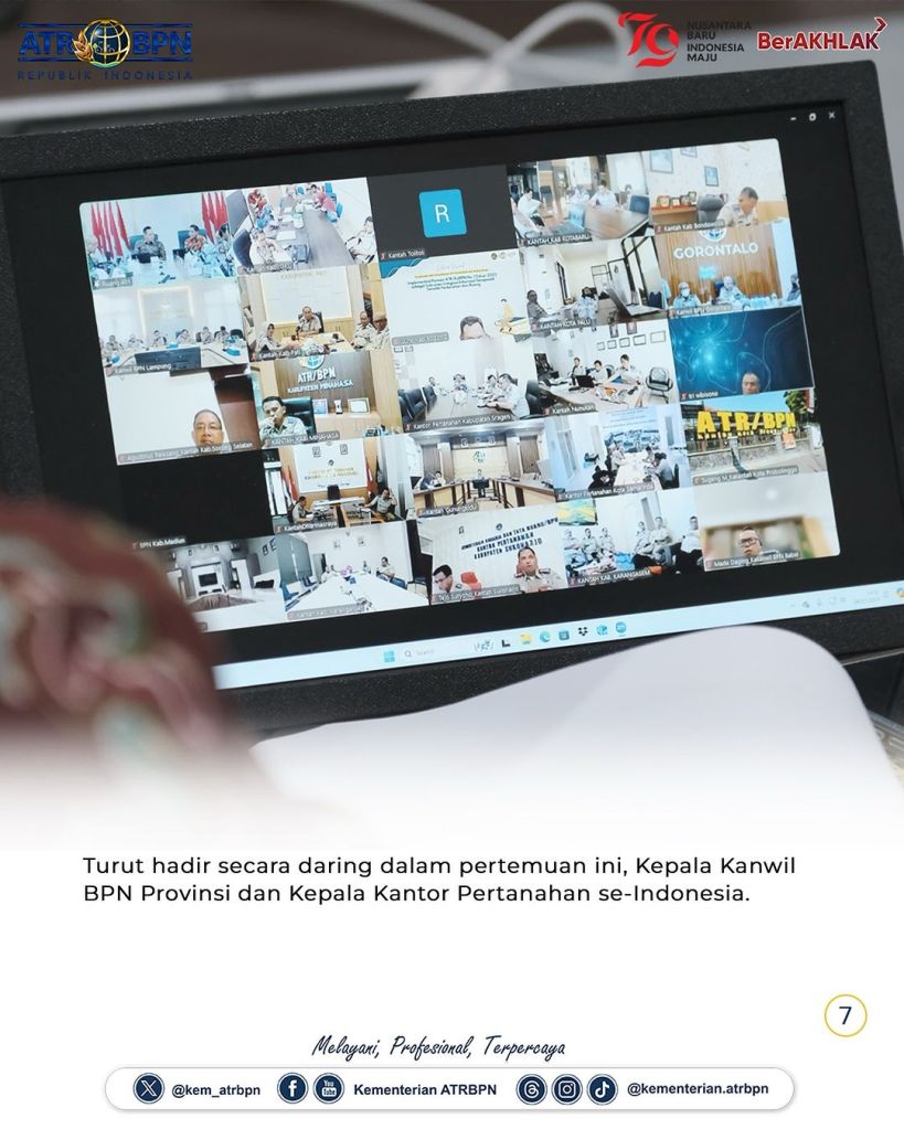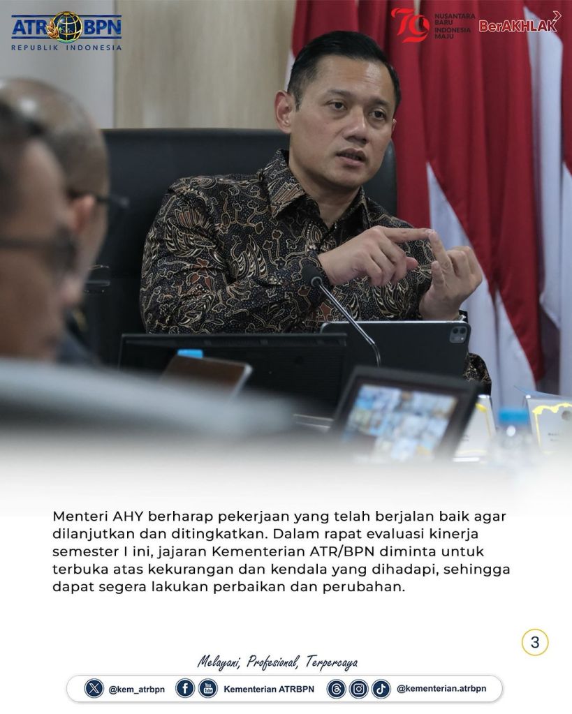 Pertemuan ini membahas update pekerjaan yang sudah dilaksanakan serta melakukan evaluasi kinerja jajaran Kementerian ATR/BPN pada semester I tahun 2024. Evaluasi dilakukan terhadap Penyerapan Anggaran; Pembangunan Zona Integritas; Layanan Sertipikat Tanah Elektronik; Pelaksanaan Program Strategis Nasional, yaitu progres capaian Rencana Detail Tata Ruang (RDTR), Reforma Agraria, Pendaftaran Tanah Sistematis Lengkap (PTSL) termasuk progres Kabupaten/Kota Lengkap, dan Pengadaan Tanah; serta Capaian Tanah Telantar dan Penyelesaian Kasus-kasus Mafia Tanah.