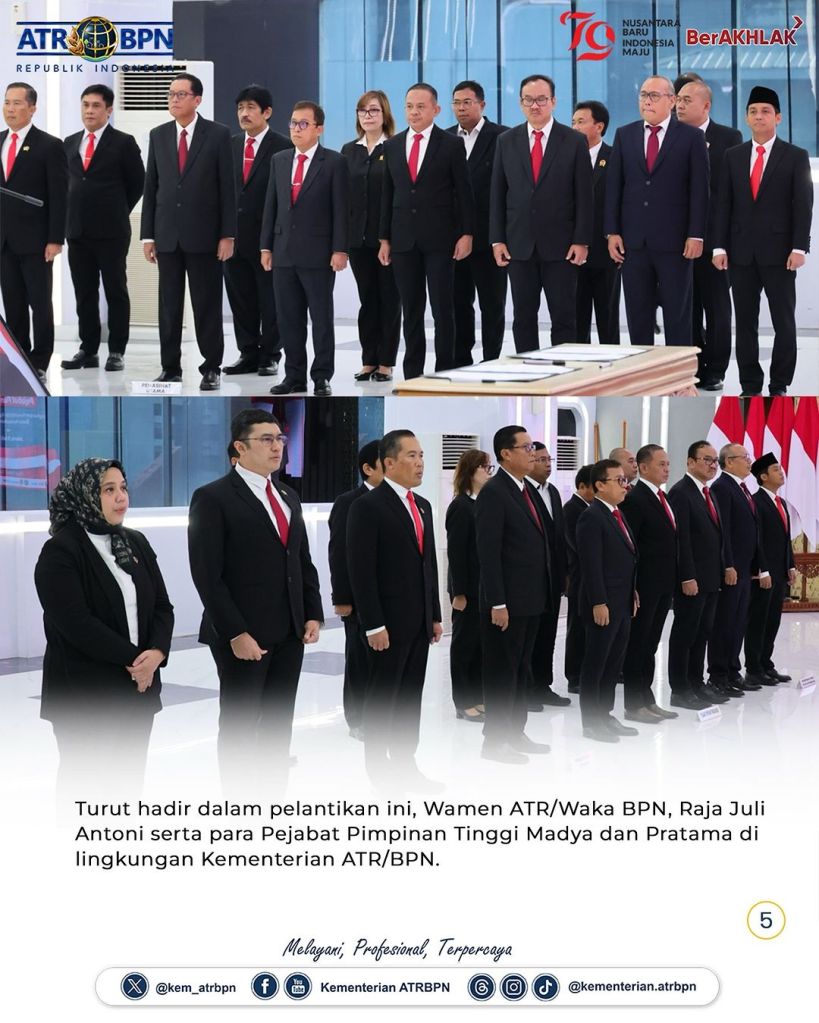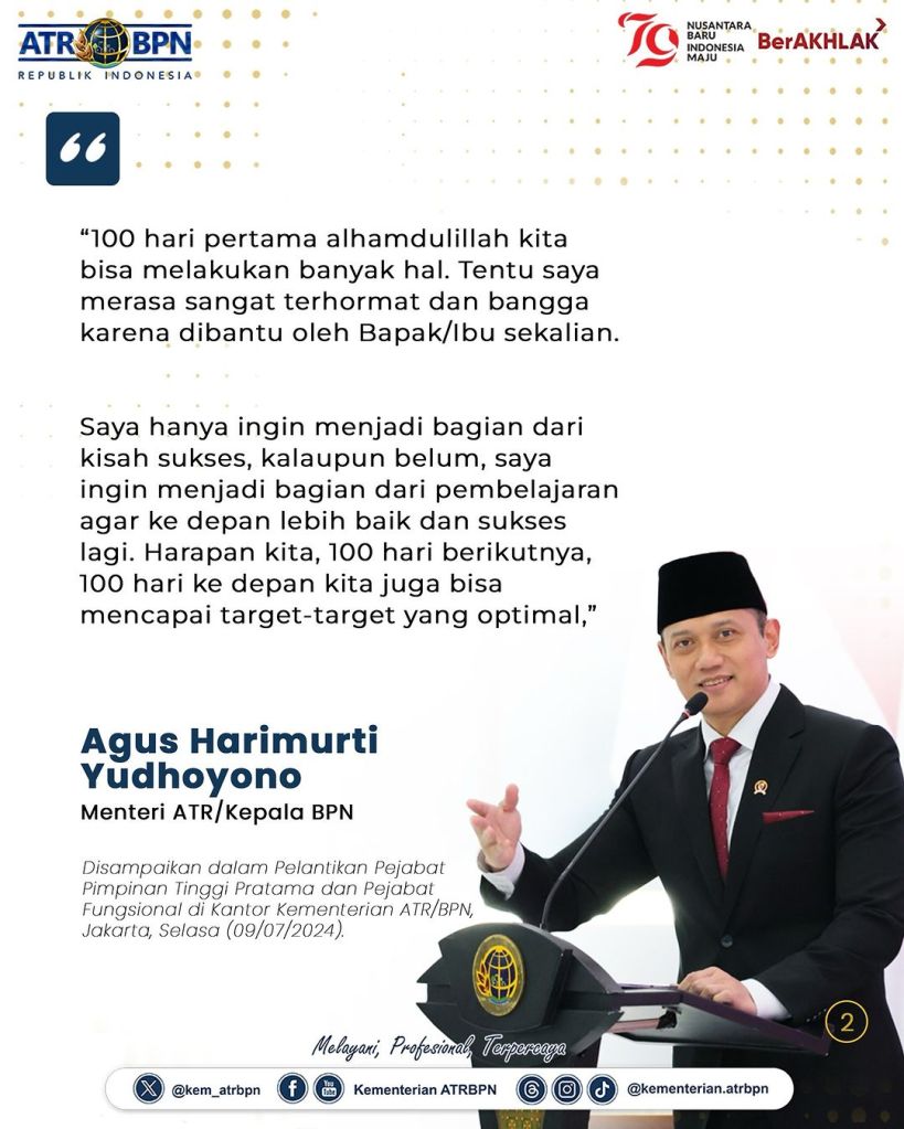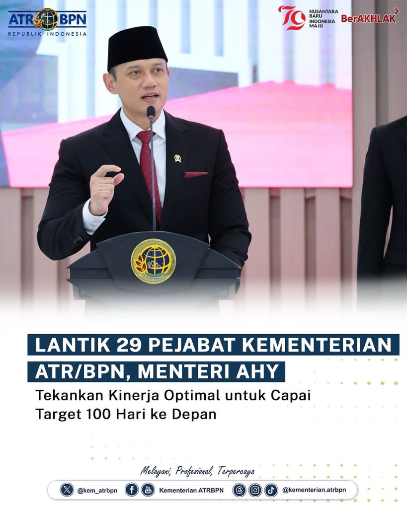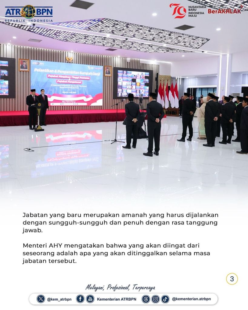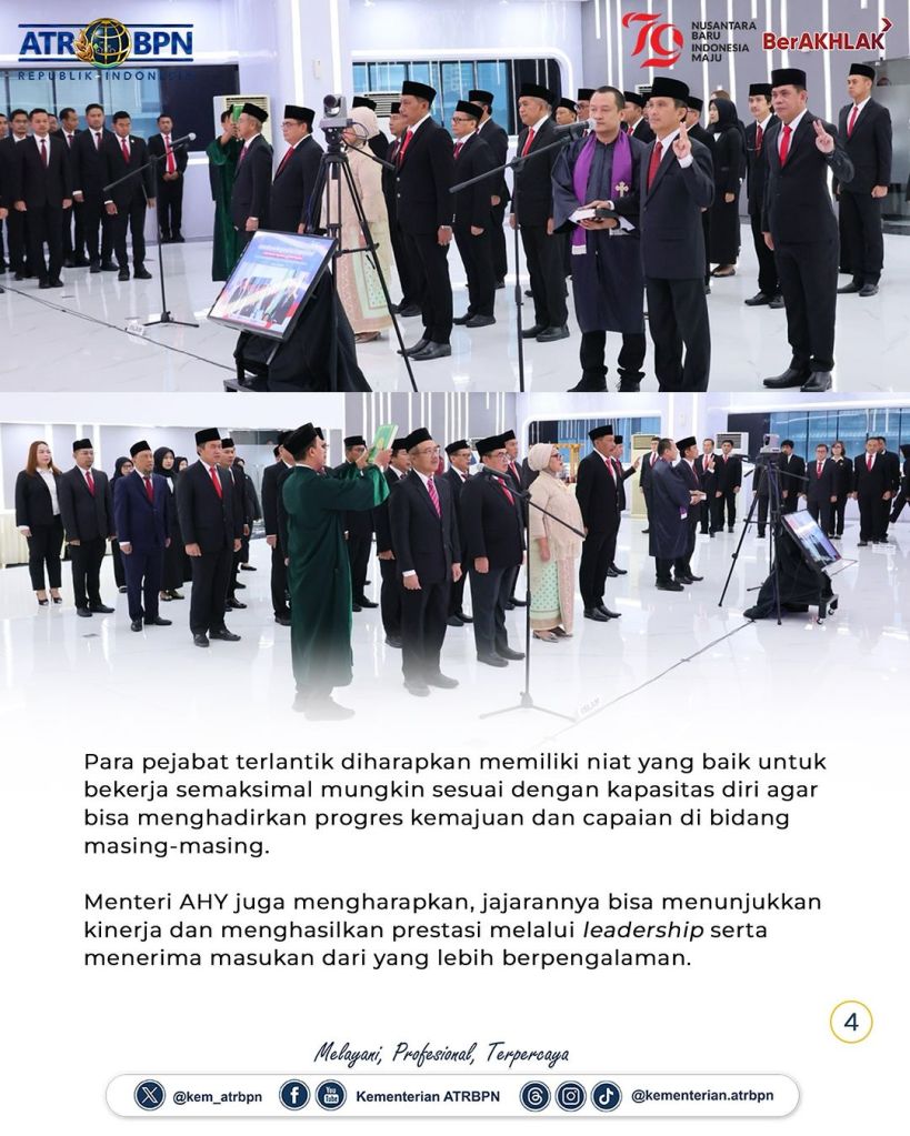 Dalam sambutannya, Menteri AHY menekankan para pejabat yang baru dilantik untuk meningkatkan kinerja dan capaian program strategis menuju masa transisi kepemimpinan nasional pada Oktober mendatang.