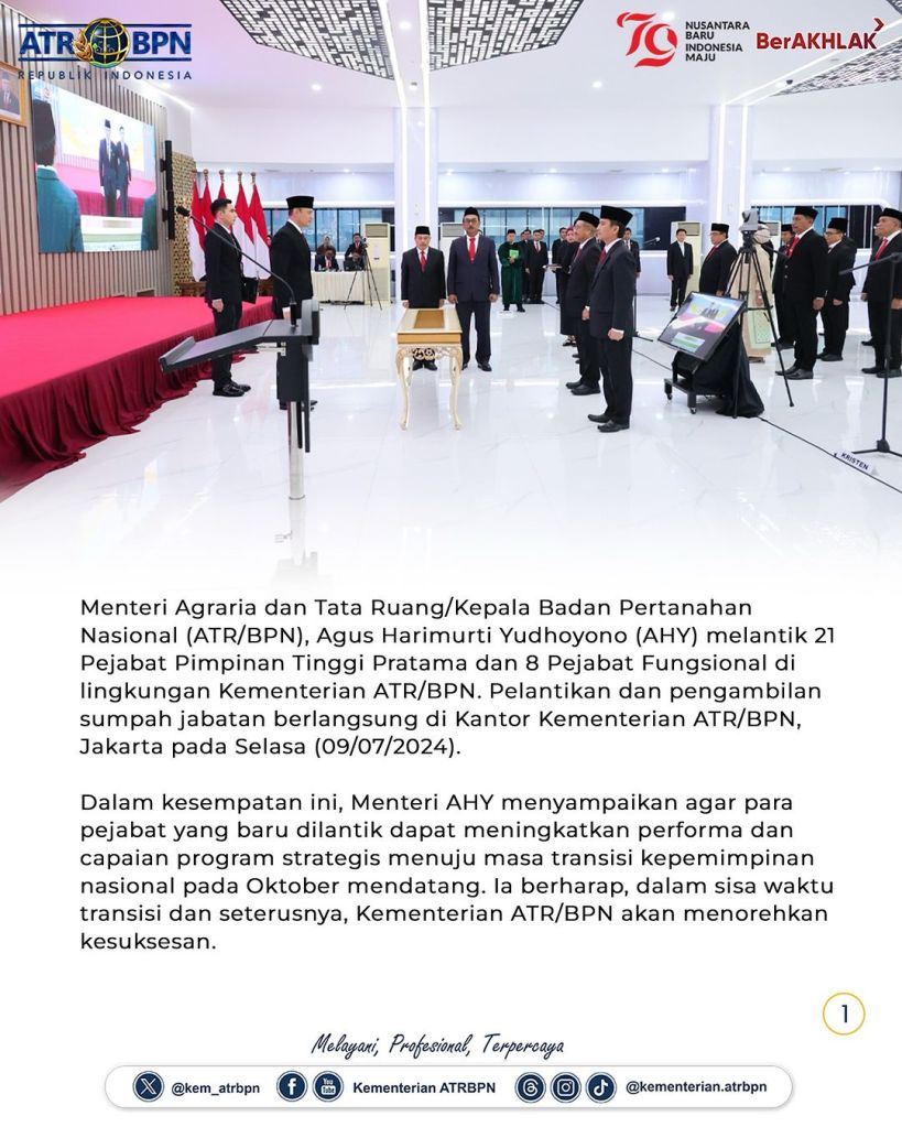 Menteri Agraria dan Tata Ruang/Kepala Badan Pertanahan Nasional (ATR/BPN), Agus Harimurti Yudhoyono (AHY) melantik 21 Pejabat Pimpinan Tinggi Pratama dan 8 Pejabat Fungsional di lingkungan Kementerian ATR/BPN. Pelantikan dan pengambilan sumpah jabatan berlangsung di Kantor Kementerian ATR/BPN, Jakarta pada Selasa (09/07/2024).