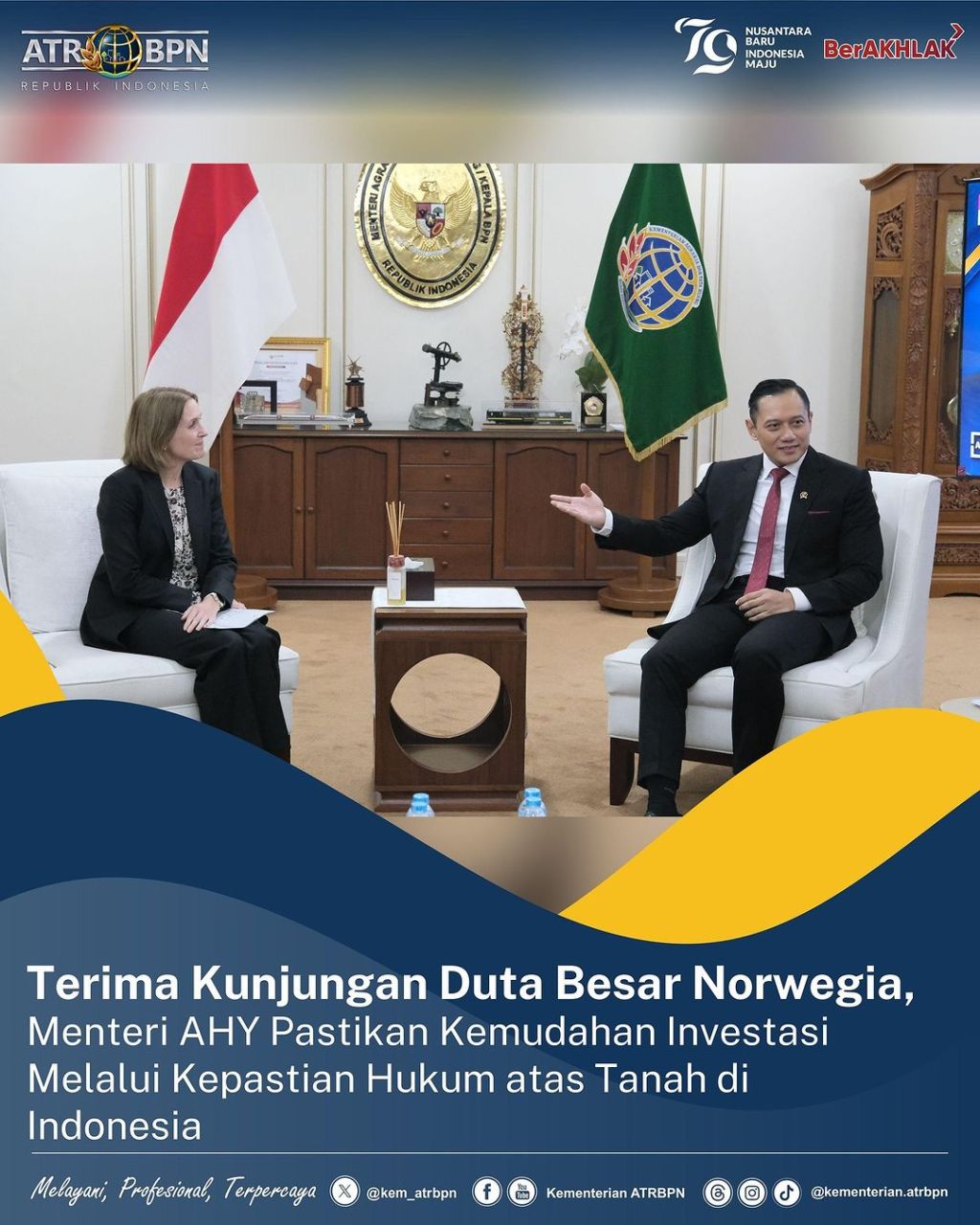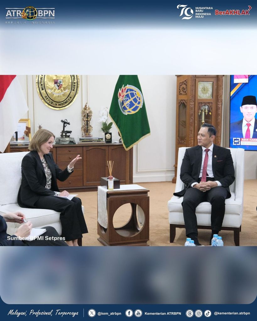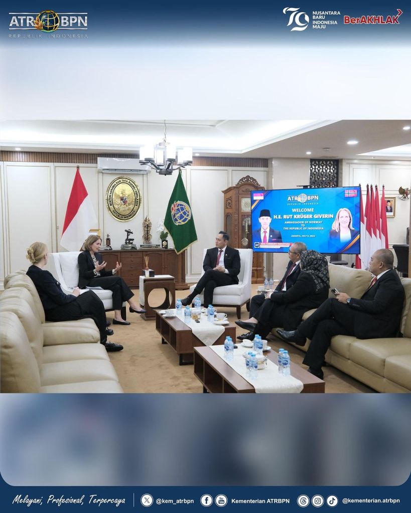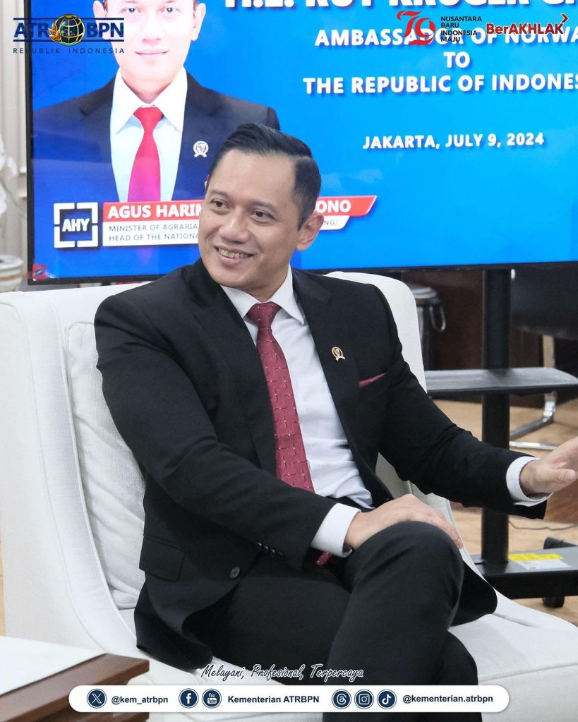 Menteri Agraria dan Tata Ruang/Kepala Badan Pertanahan Nasional (ATR/BPN), Agus Harimurti Yudhoyono (AHY) menerima kunjungan Duta Besar Norwegia untuk Indonesia, Rut Kruger Griven di Ruang Menteri, Kementerian ATR/BPN, Jakarta pada Selasa (09/07/2024).