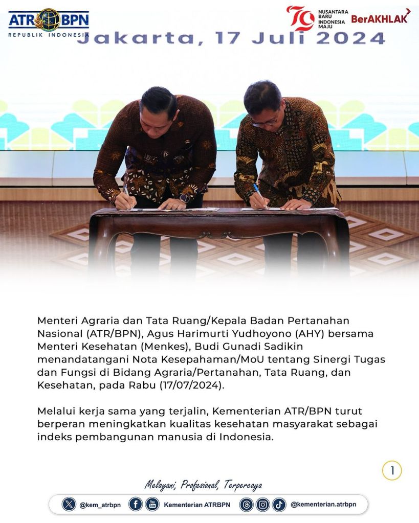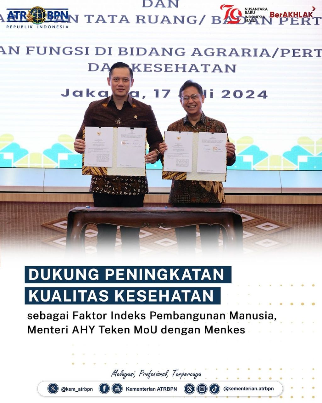Menteri Agraria dan Tata Ruang/Kepala Badan Pertanahan Nasional (ATR/BPN), Agus Harimurti Yudhoyono (AHY) bersama Menteri Kesehatan (Menkes), Budi Gunadi Sadikin menandatangani Nota Kesepahaman/MoU tentang Sinergi Tugas dan Fungsi di Bidang Agraria/Pertanahan, Tata Ruang, dan Kesehatan, pada Rabu (17/07/2024). Melalui kerja sama yang terjalin, Kementerian ATR/BPN turut berperan meningkatkan kualitas kesehatan masyarakat sebagai indeks pembangunan manusia di Indonesia.