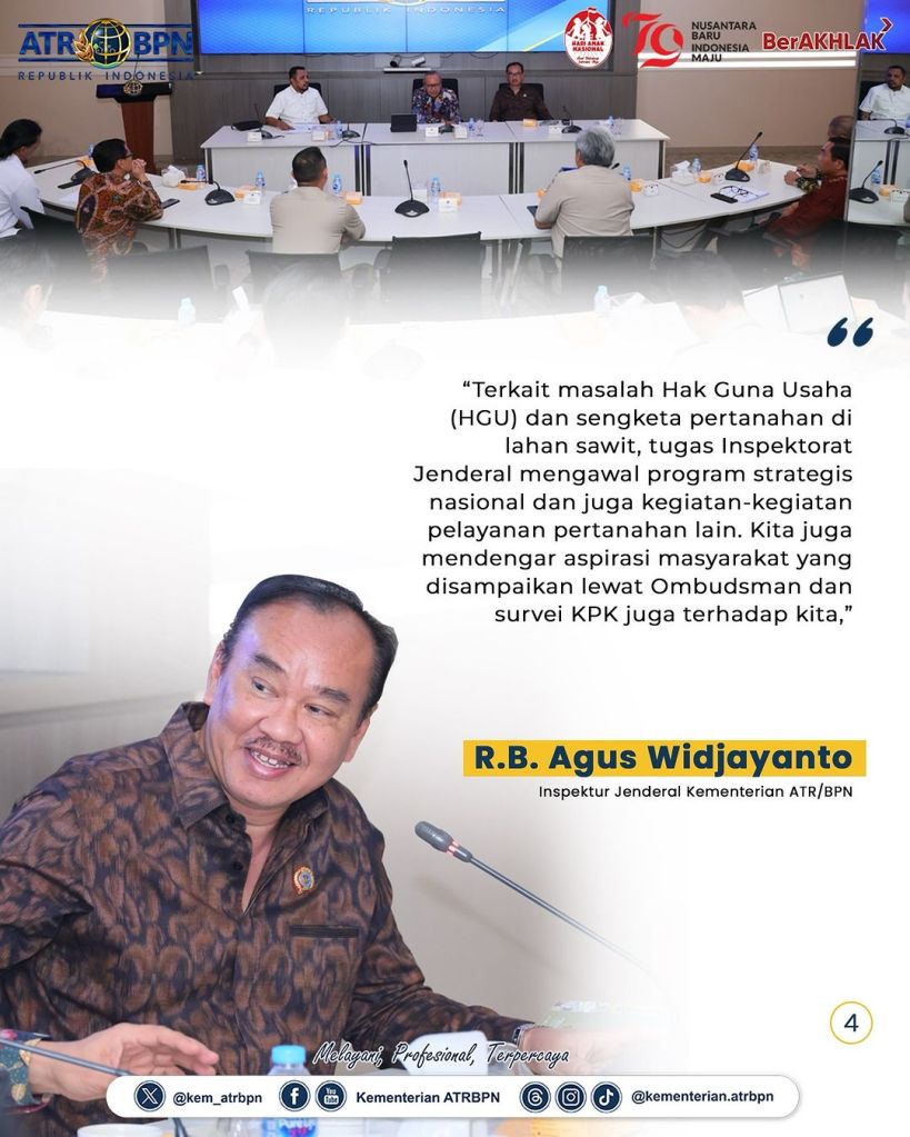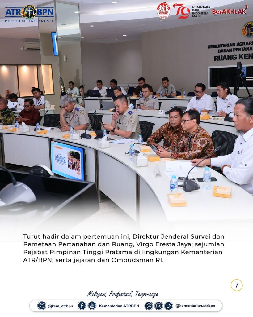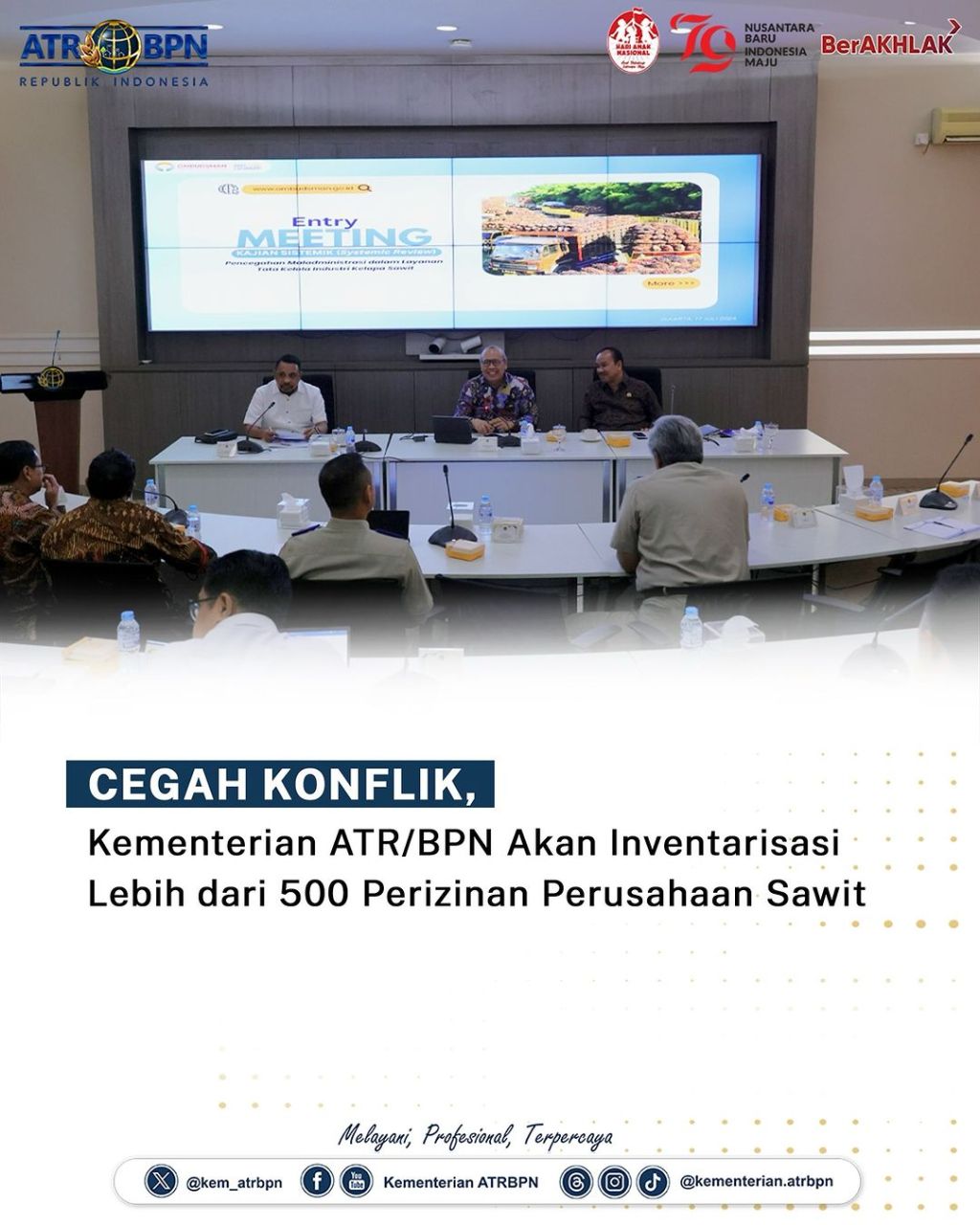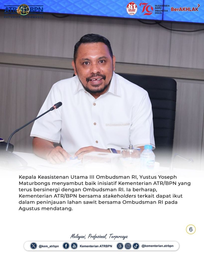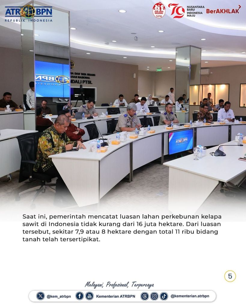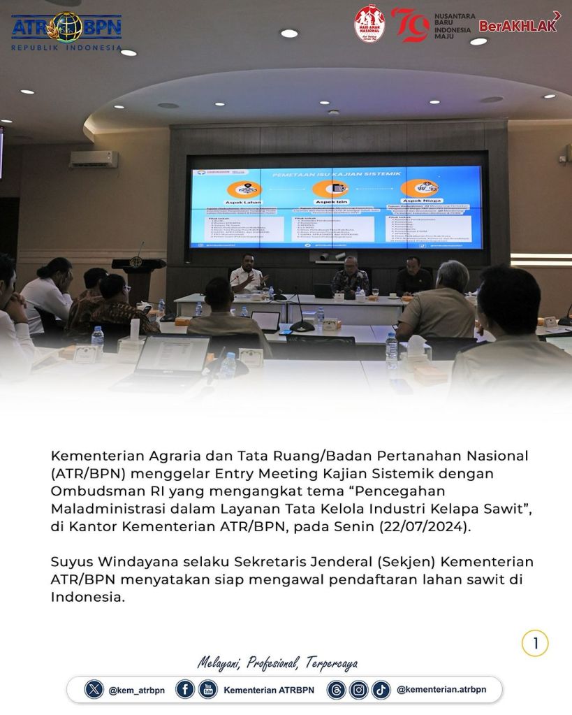 ementerian Agraria dan Tata Ruang/Badan Pertanahan Nasional (ATR/BPN) siap mengawal pendaftaran lahan perkebunan kelapa sawit di seluruh Indonesia. Hal ini disampaikan langsung oleh Sekretaris Jenderal (Sekjen) Kementerian ATR/BPN, Suyus Windayana, dalam Entry Meeting Kajian Sistemik Bersama Ombudsman RI pada Senin (22/07/2024), di Kantor Kementerian ATR/BPN Jakarta.