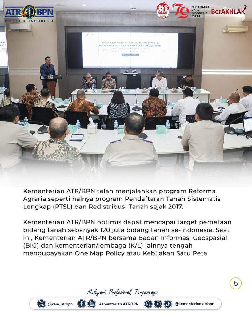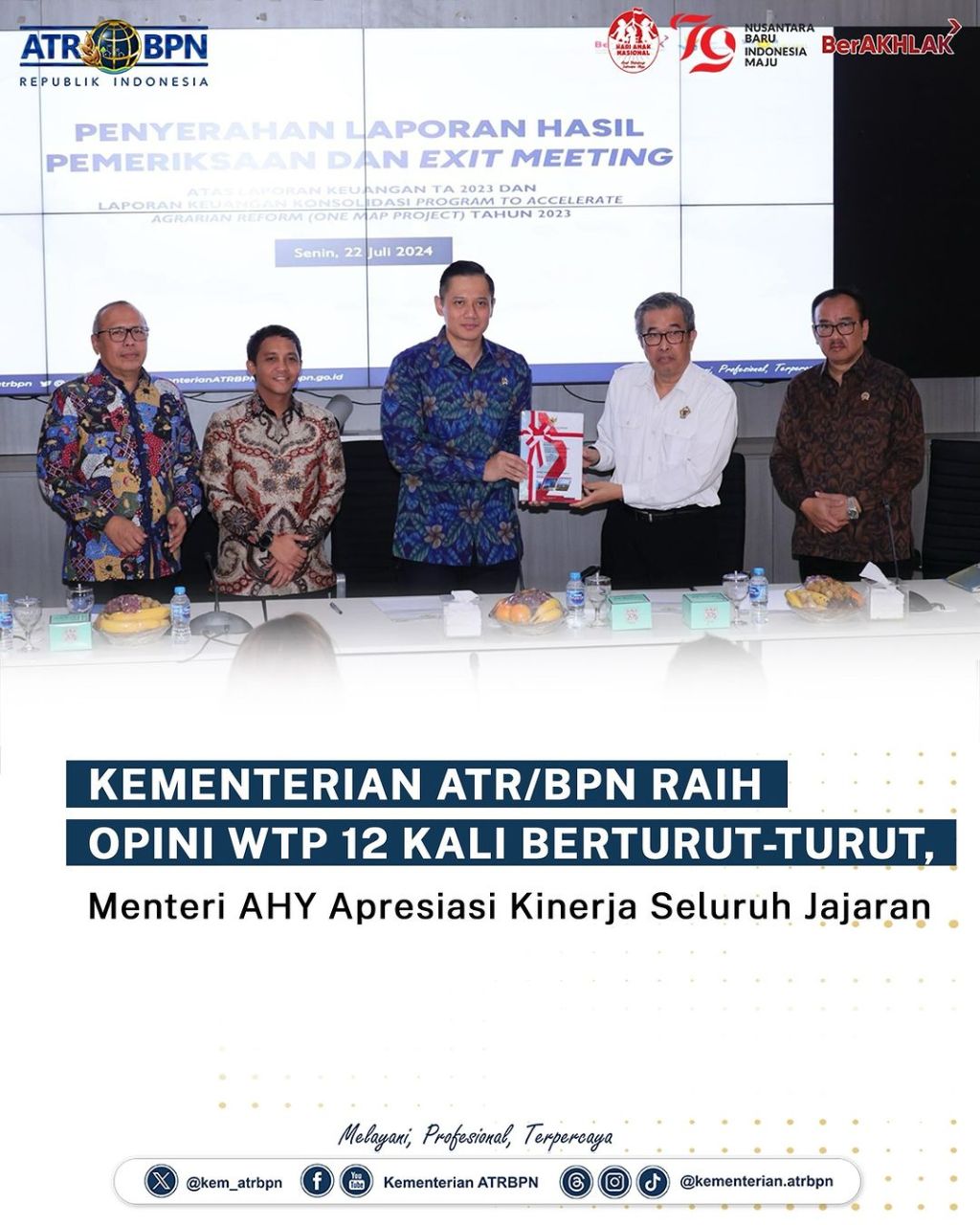 Menteri Agraria dan Tata Ruang/Kepala Badan Pertanahan Nasional (ATR/BPN), Agus Harimurti Yudhoyono (AHY) mengapresiasi pencapaian kinerja seluruh jajaran Kementerian ATR/BPN, sehingga sukses mendapatkan opini Wajar Tanpa Pengecualian (WTP) selama 12 tahun berturut-turut. Hal itu ia sampaikan dalam kegiatan Penyerahan Laporan Hasil Pemeriksaan Atas Laporan Keuangan Tahun 2023 dan Exit Meeting Pemeriksaan Atas Laporan Keuangan Konsolidasi Program to Accelerate Agrarian Reform (One Map Project) Tahun 2023, Senin (22/07/2024).