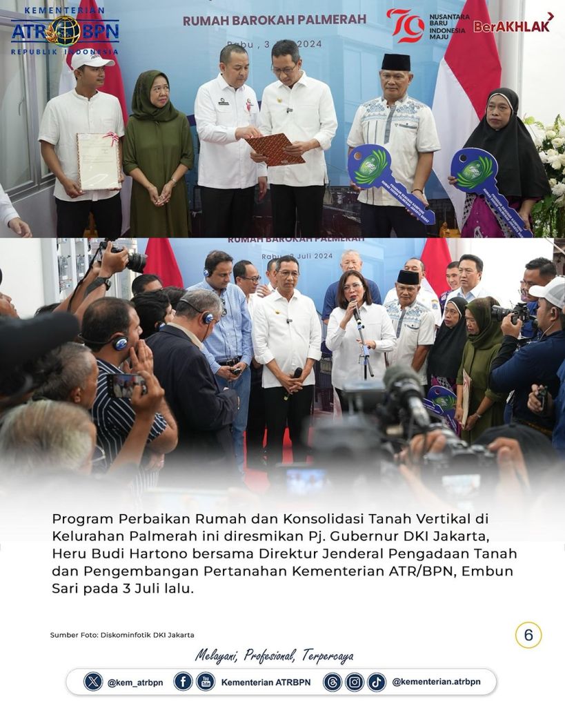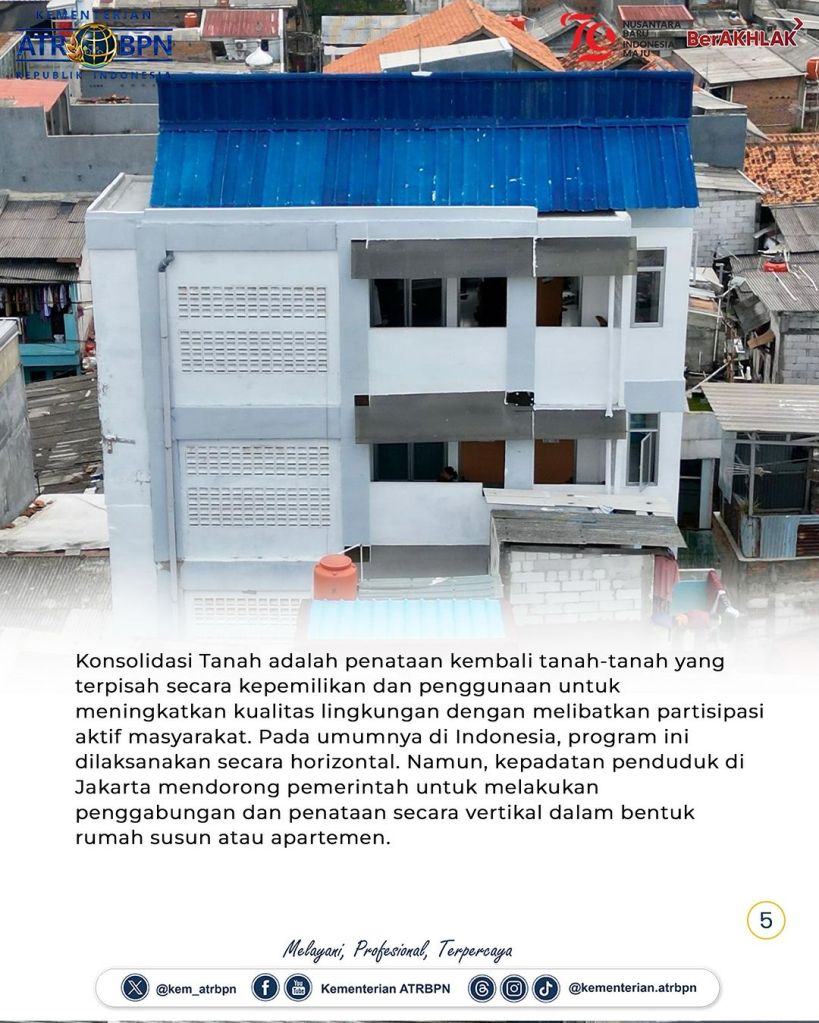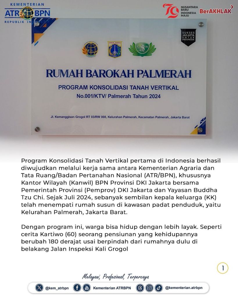 Program Konsolidasi Tanah Vertikal pertama di Indonesia berhasil diwujudkan melalui kerja sama antara Kementerian Agraria dan Tata Ruang/Badan Pertanahan Nasional (ATR/BPN), khususnya Kantor Wilayah (Kanwil) BPN Provinsi DKI Jakarta bersama Pemerintah Provinsi (Pemprov) DKI Jakarta dan Yayasan Buddha Tzu Chi. Sejak Juli 2024, sebanyak sembilan kepala keluarga (KK) telah menempati rumah susun di kawasan padat penduduk, yaitu Kelurahan Palmerah, Jakarta Barat.