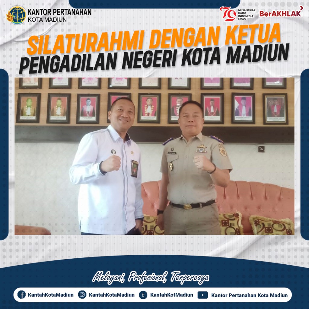 Halo #SobATRBPN, Hari ini Senin (05/08/2024) Kepala Kantor Pertanahan Kota Madiun, Bapak Adolf Severlianus Puahadi, S.SiT., M.M. bersilaturahmi ke Kantor Pengadilan Negeri Kota Madiun dan disambut langsung oleh Ketua Pengadilan Negeri Kota Madiun, Bapak Dr. Boedi Haryantho, S.H., M.H.