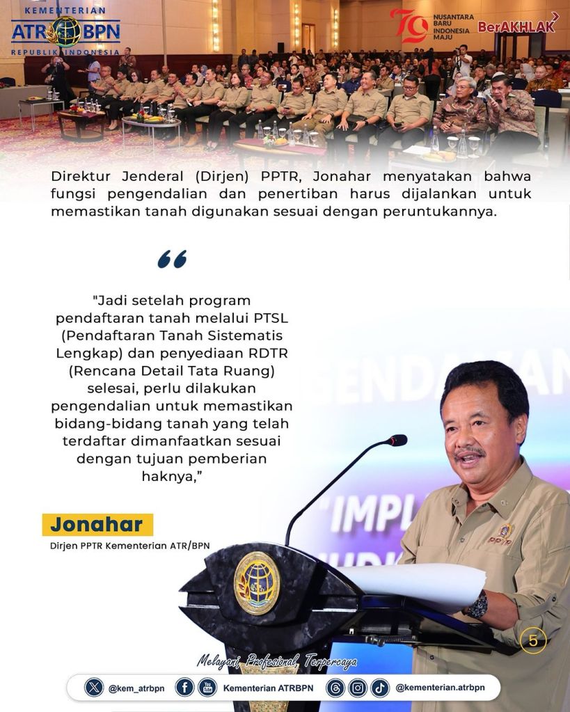 Menteri Agraria dan Tata Ruang/Kepala Badan Pertanahan Nasional (ATR/BPN), Agus Harimurti Yudhoyono (AHY) mendorong pembangunan berkelanjutan yang bukan hanya memperhatikan lingkungan, namun juga humanis. Menurutnya, hal itu menjadi tugas Direktorat Jenderal Pengendalian dan Penertiban Tanah dan Ruang (Ditjen PPTR) untuk memastikan pertumbuhan ekonomi yang dihasilkan dari pembangunan tercipta berkelanjutan dan berkeadilan bagi masyarakat.