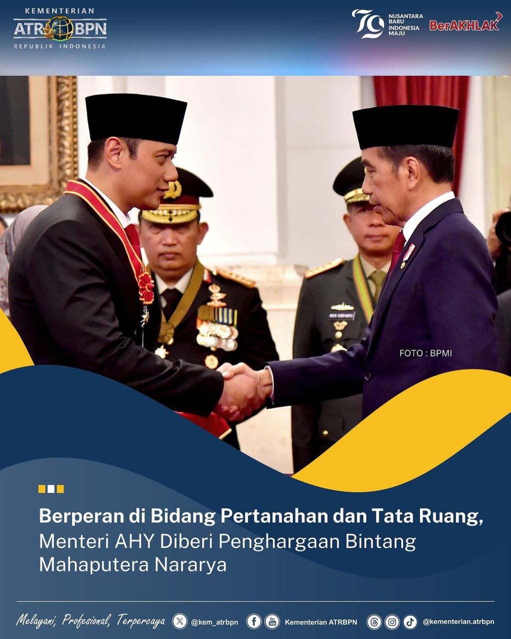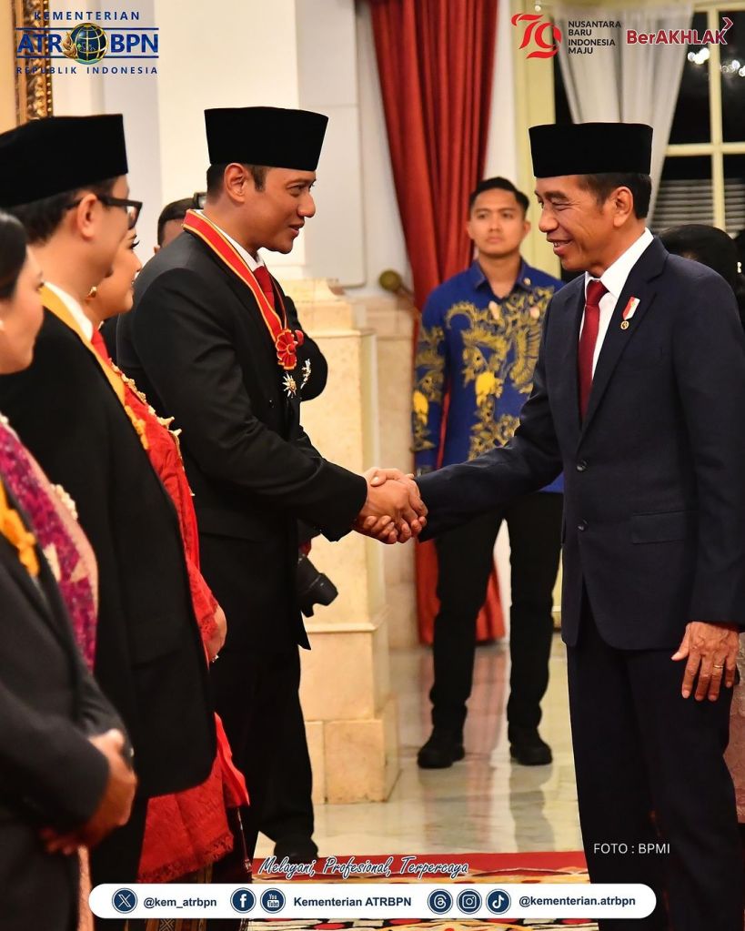 Menteri Agraria dan Tata Ruang/Kepala Badan Pertanahan Nasional (ATR/BPN), Agus Harimurti Yudhoyono (AHY) menerima tanda penghormatan Bintang Mahaputera Nararya dari Presiden Republik Indonesia (RI), Joko Widodo di Istana Negara, Jakarta pada Rabu (14/08/2024). Penghargaan ini diberikan atas dasar kontribusi Menteri AHY dalam bidang pertanahan dan tata ruang.