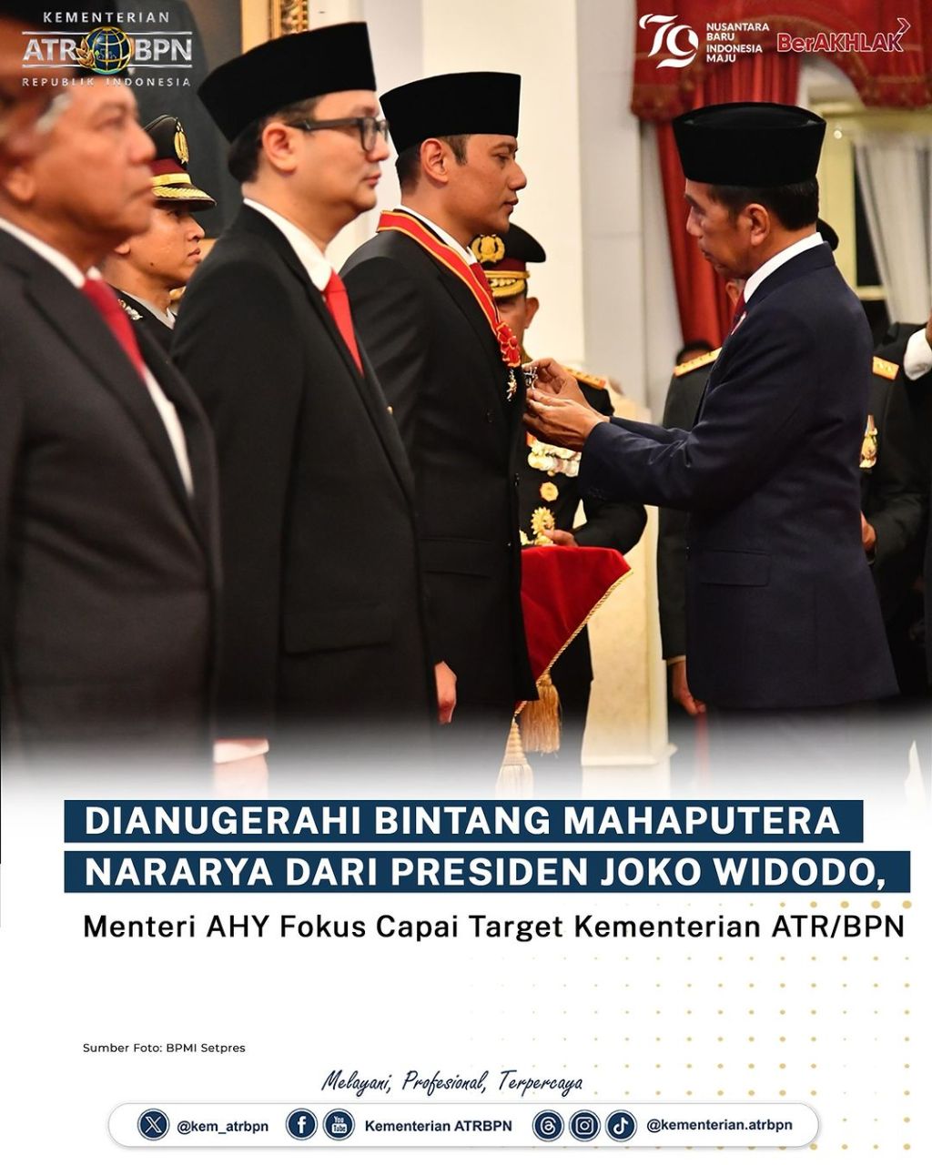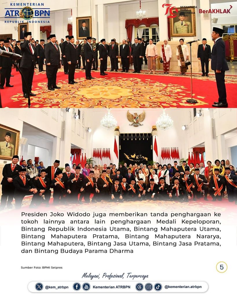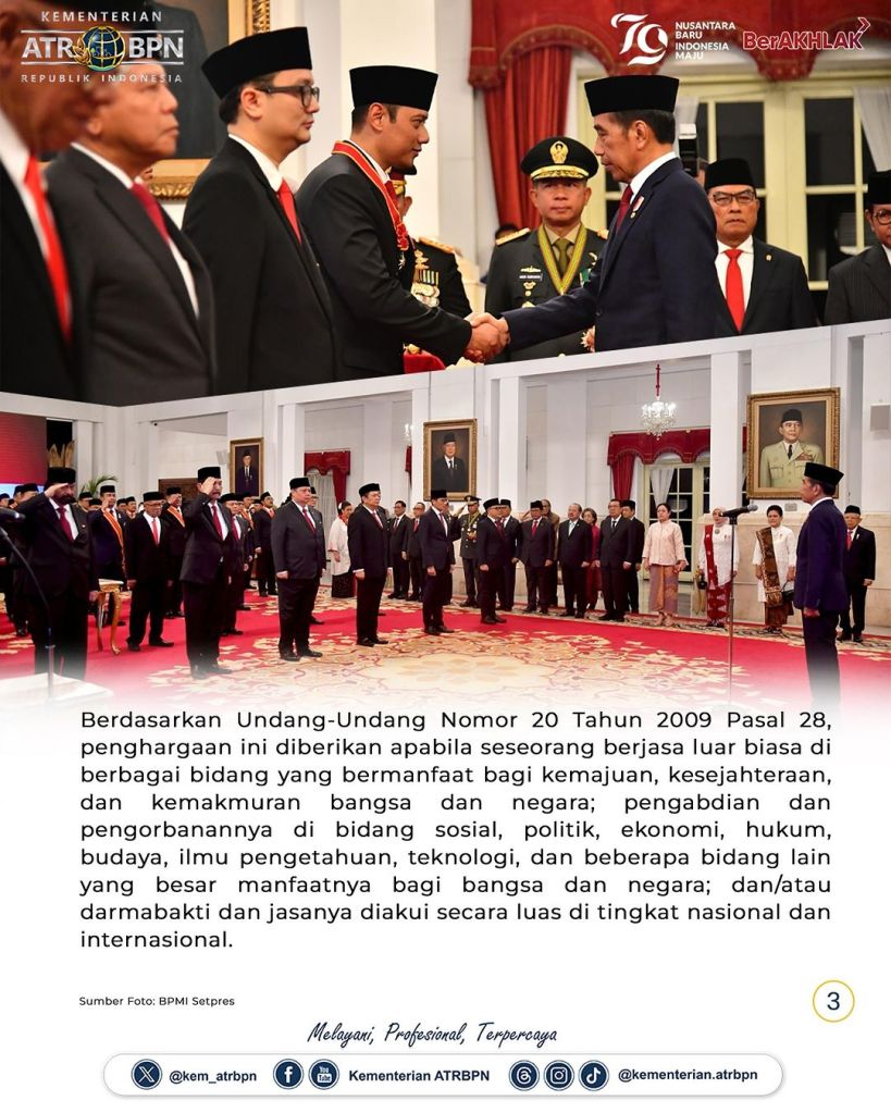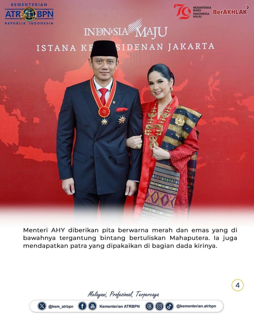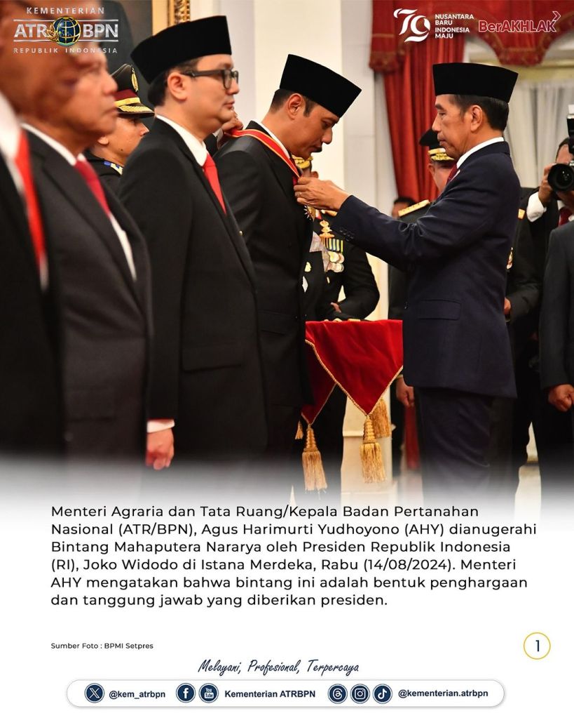 Menteri Agraria dan Tata Ruang/Kepala Badan Pertanahan Nasional (ATR/BPN), Agus Harimurti Yudhoyono (AHY) dianugerahi Bintang Mahaputera Nararya oleh Presiden Republik Indonesia (RI), Joko Widodo di Istana Merdeka, Rabu (14/08/2024). Menteri AHY mengatakan bahwa bintang ini adalah bentuk penghargaan dan tanggung jawab yang diberikan presiden.