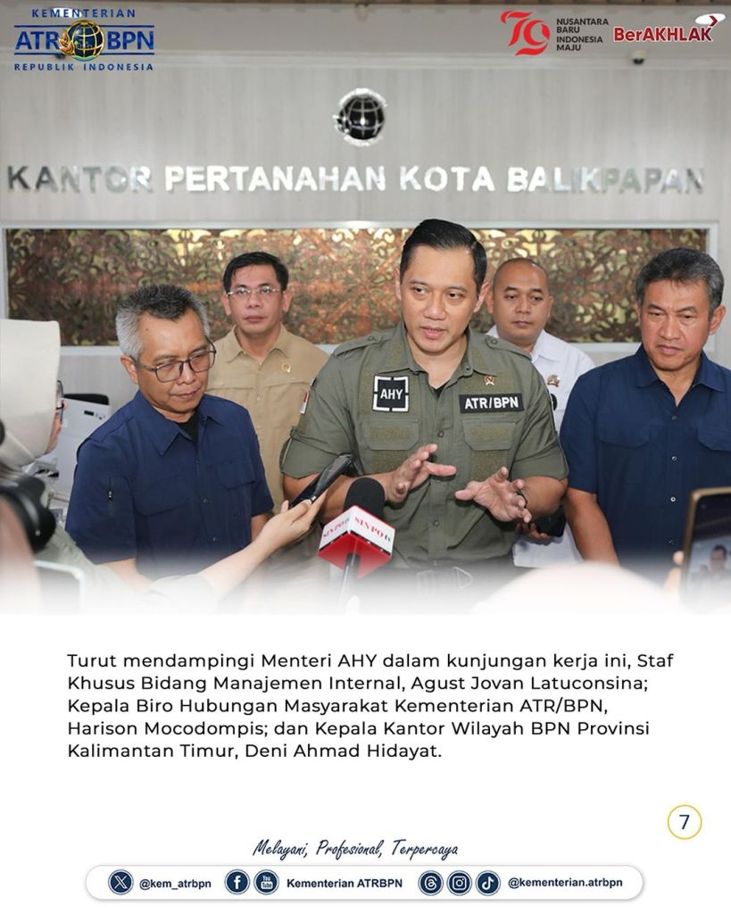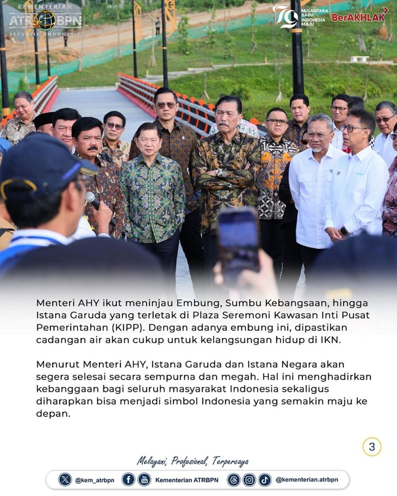 Menteri Agraria dan Tata Ruang/Kepala Badan Pertanahan Nasional (ATR/BPN), Agus Harimurti Yudhoyono (AHY) mengikuti peninjauan Embung MBH dan Sumbu Kebangsaan di Ibu Kota Nusantara (IKN) bersama Presiden Republik Indonesia (RI), Joko Widodo; Wakil Presiden RI, Ma’ruf Amin; serta Menteri Kabinet Indonesia Maju (KIM) pada Senin pagi (12/08/2024).