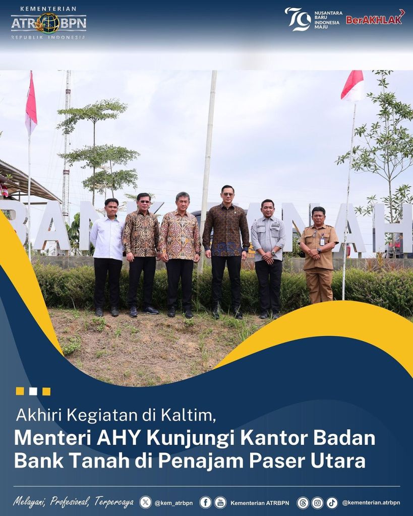 Mengakhiri kunjungan kerjanya di Provinsi Kalimantan Timur (Kaltim) pada Senin (12/08/2024), Menteri Agraria dan Tata Ruang/Kepala Badan Pertanahan Nasional (ATR/BPN), Agus Harimurti Yudhoyono (AHY) mengunjungi Kantor Badan Bank Tanah yang terletak di Kabupaten Penajam Paser Utara. Kehadirannya disambut oleh Team Leader Project Badan Bank Tanah Penajam Paser Utara (PPU), Moh Syafran Zamzami.