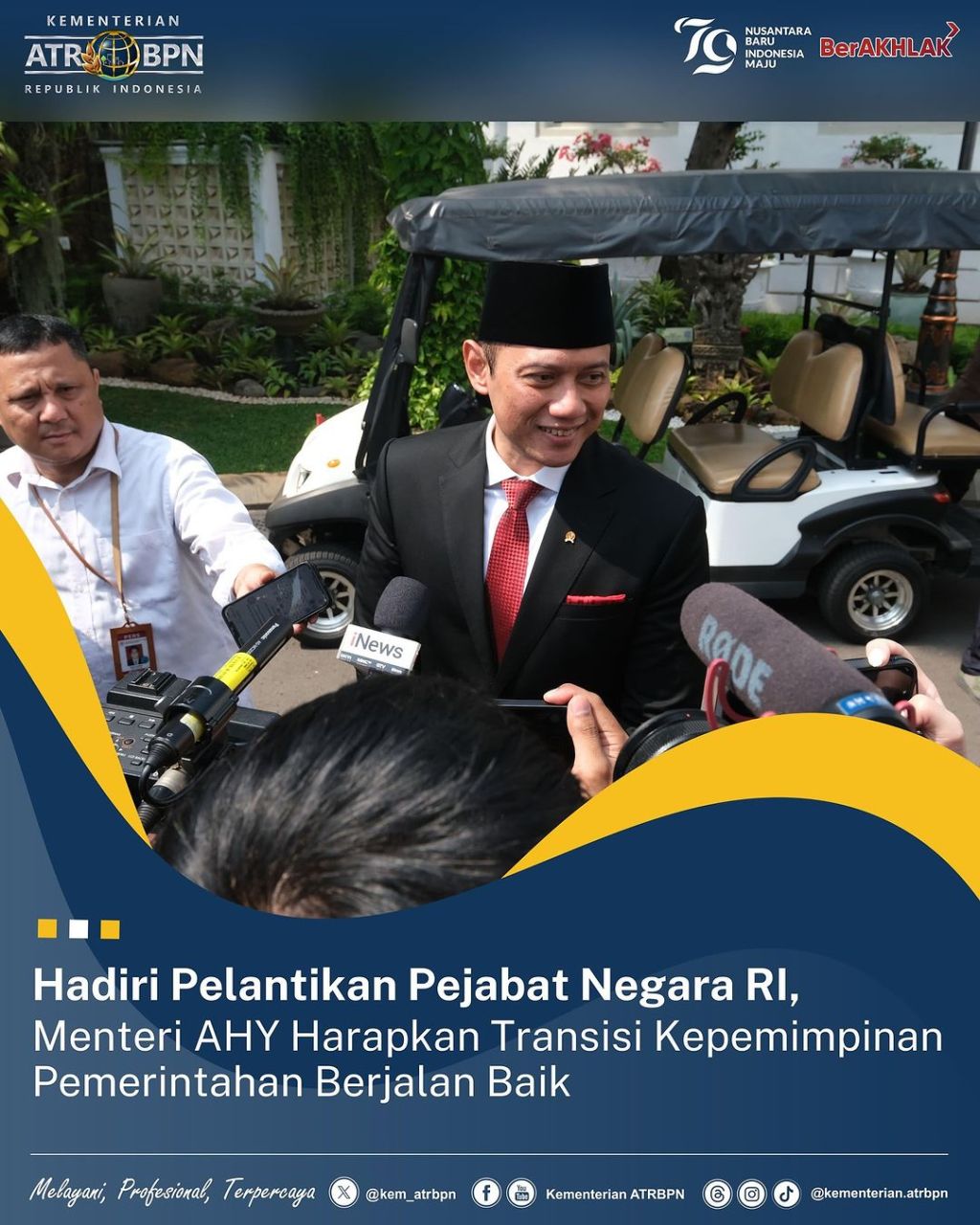 “Tentunya kita menyambut dengan sukacita, dengan ucapan selamat, dan semoga sukses menjalankan tugas dan amanah baru. Tapi sekaligus saya pribadi mengucapkan selamat juga dan terima kasih kepada para menteri sebelumnya yang telah menjalankan tugas untuk negara selama ini,” ujar Menteri AHY saat ditemui awak media.
