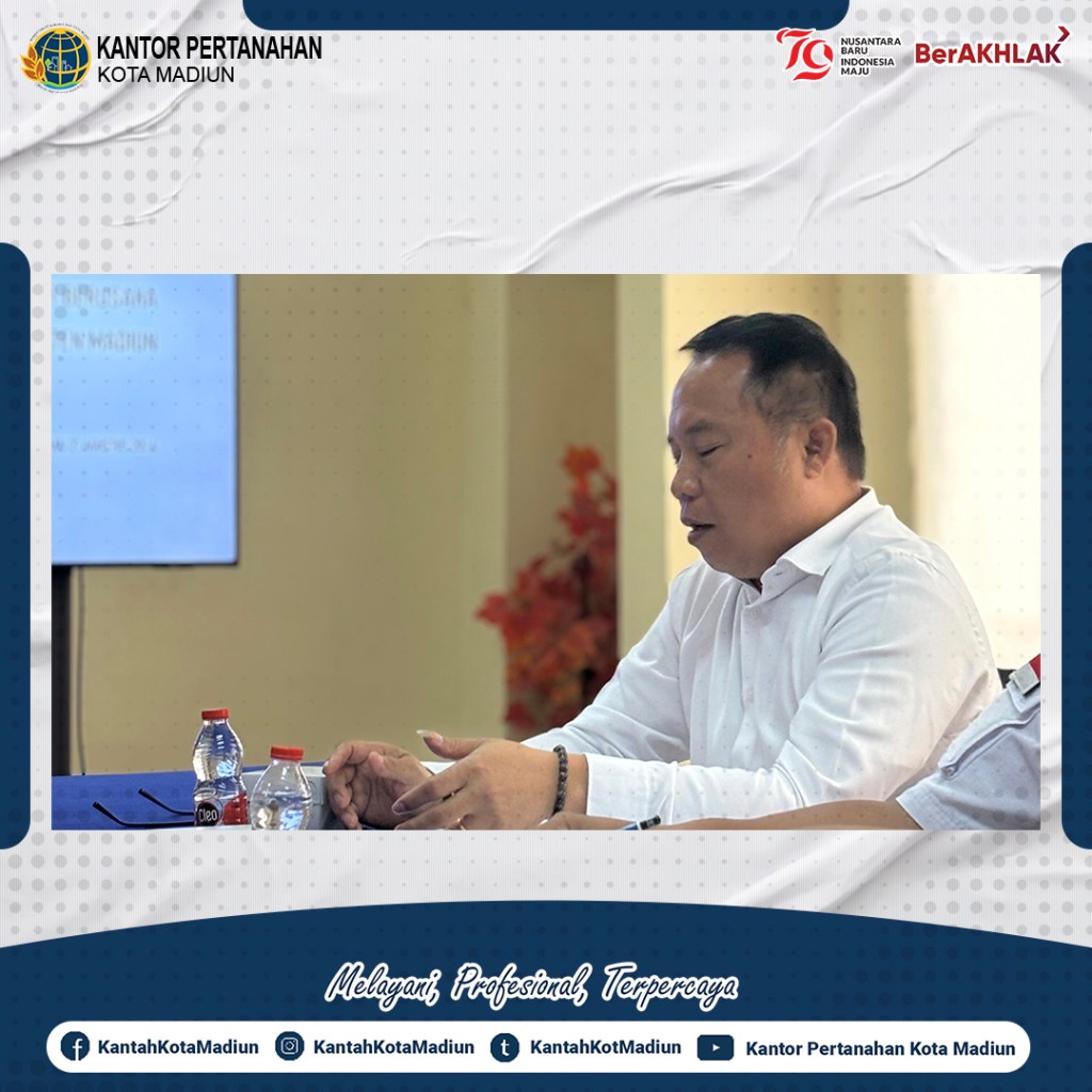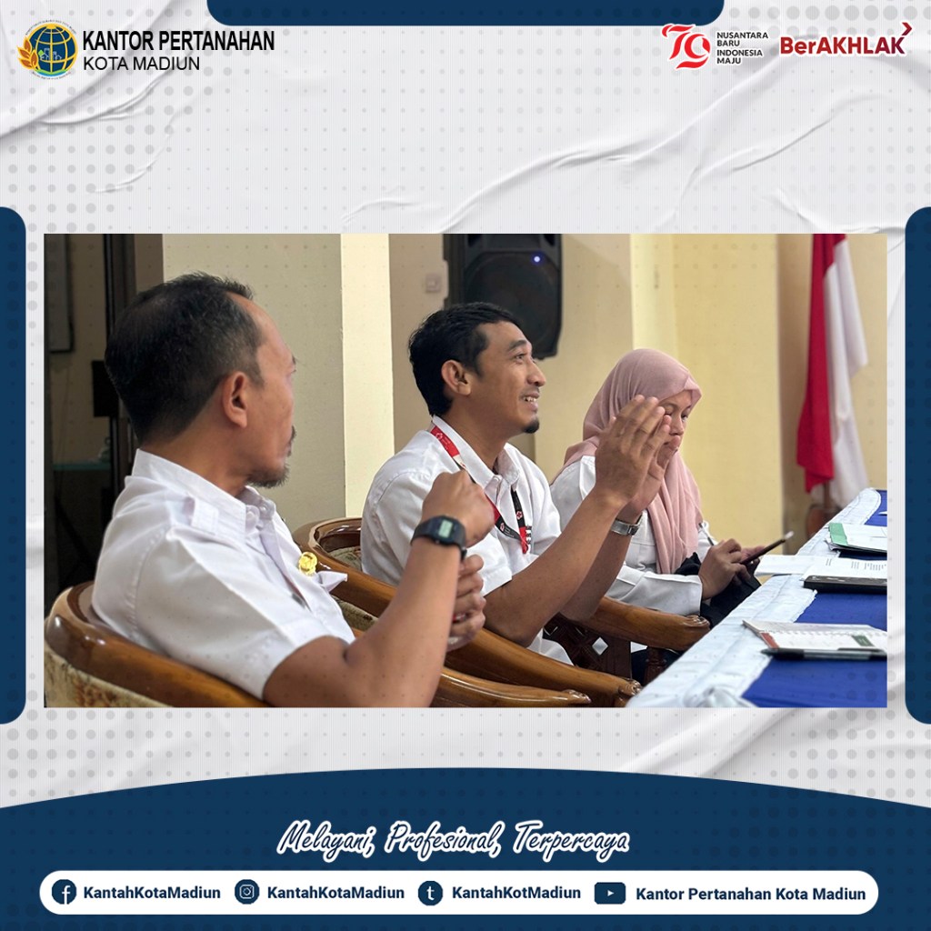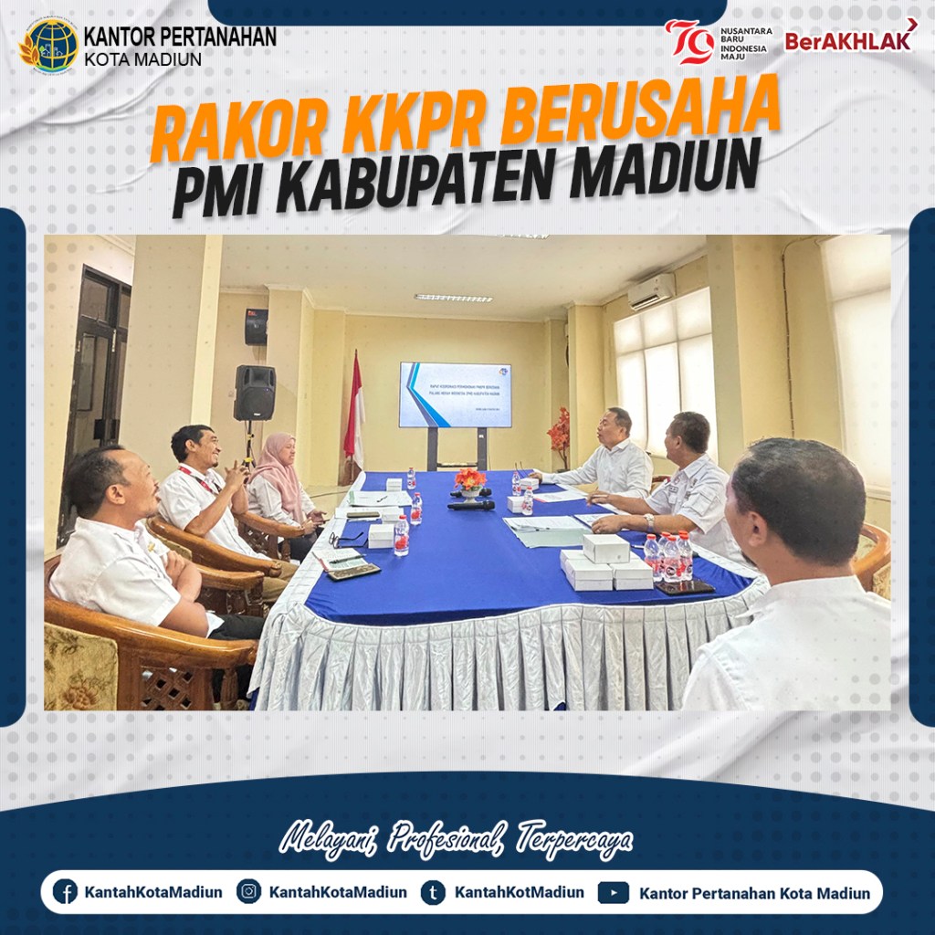Halo #SobATRBPN, Hari ini Rabu (21/08/2024) Kantor Pertanahan Kota Madiun melaksanakan Rapat Koordinasi Kesesuaian Kegiatan Pemanfaatan Ruang (KKPR) Berusaha Palang Merah Indonesia (PMI) Kabupaten Madiun yang bertempat di Ruang Rapat Lantai 2 Kantor Pertanahan Kota Madiun.