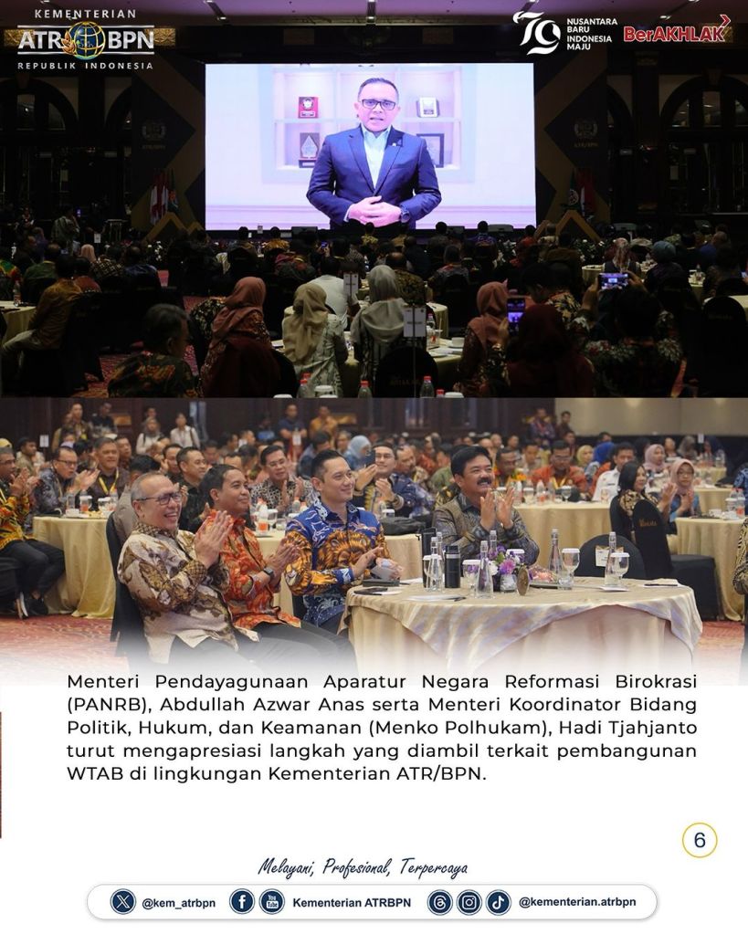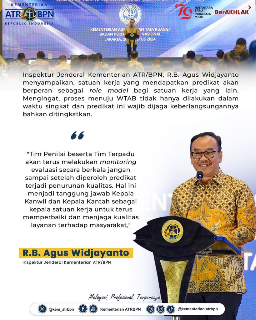 “WTAB menjadi landasan menuju WBK (Wilayah Bebas dari Korupsi, red) dan WBBM (Wilayah Birokrasi Bersih dan Melayani, red) dan pada akhirnya ATR/BPN bisa menghadirkan pelayanan publik yang semakin akuntabel, transparan, profesional, dan melayani,” lanjut Menteri AHY.