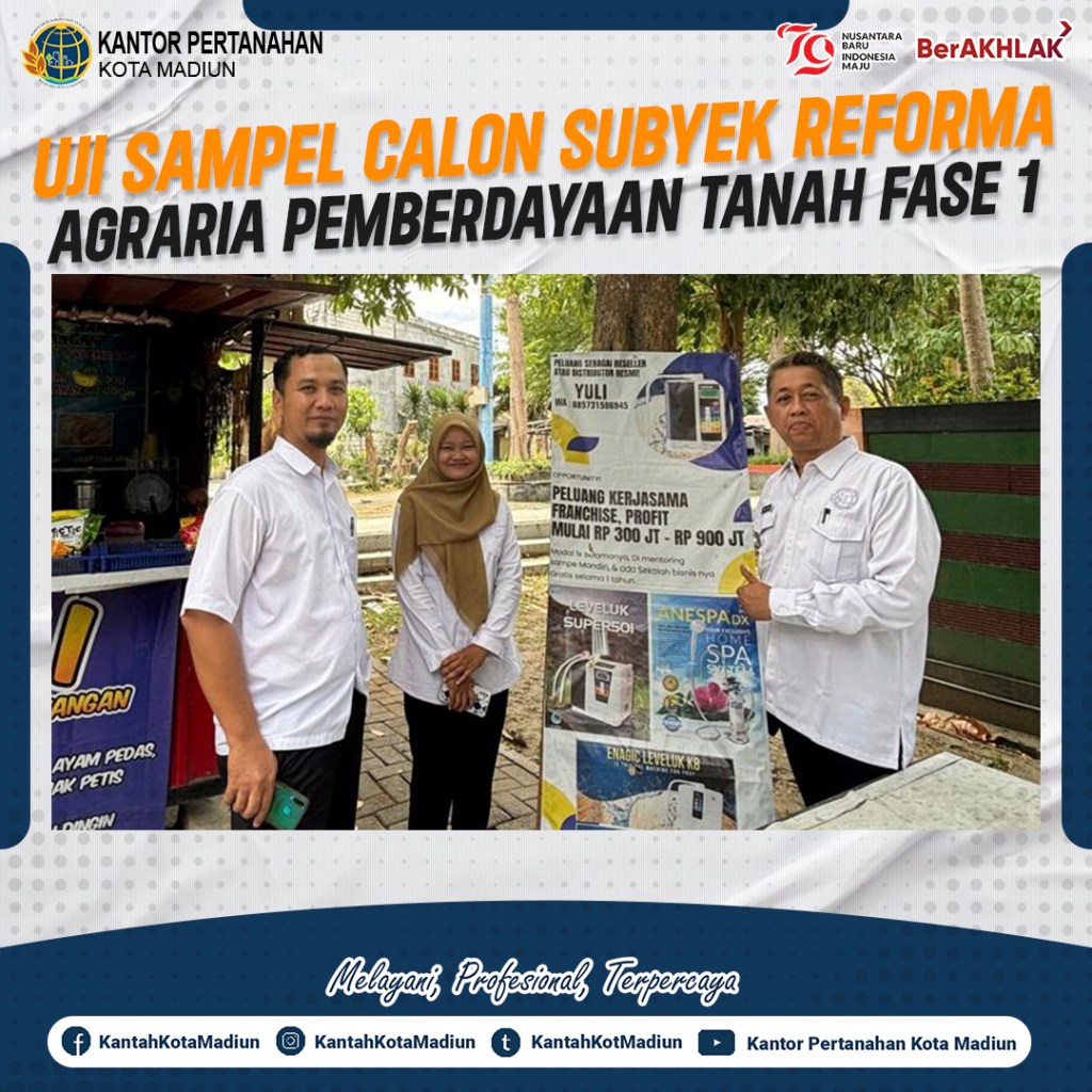 Halo #SobATRBPN, Hari ini Rabu (28/08/2024) Kantor Pertanahan Kota Madiun melaksanakan Uji Sampel Calon Subyek Reforma Agraria Pemberdayaan tanah Fase 1, Kelurahan Demangan, Kecamatan Taman, Kota Madiun. Turut hadir Kepala Seksi Penataan dan Pemberdayaan, Bapak Dwi Joko Susilo, A.Ptnh., M.M.