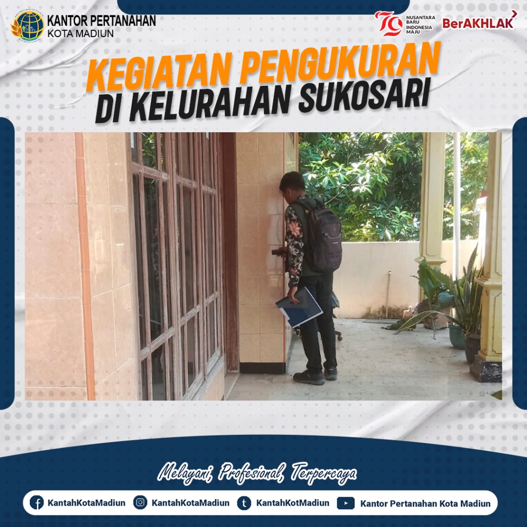 Halo #SobATRBPN, Hari ini Kamis (29/08/2024) Petugas Ukur Kantor Pertanahan Kota Madiun melaksanakan kegiatan pengukuran rutin di Kelurahan Sukosari, Kecamatan Kartoharjo, Kota Madiun.