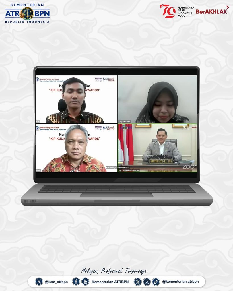 Menteri Agraria dan Tata Ruang/Kepala Badan Pertanahan Nasional (ATR/BPN), Agus Harimurti Yudhoyono (AHY) menjadi keynote speaker pada Roadshow Film Kartu Indonesia Pintar (KIP) Kuliah/Bidikmisi Awards yang berlangsung secara daring, Rabu (28/08/2024). Dalam pidatonya, Menteri AHY mengapresiasi penyelenggaraan kegiatan ini sebagai upaya meningkatkan sumber daya manusia (SDM) Indonesia, khususnya generasi muda melalui kreativitas yang dituangkan ke dalam produksi film pendek.