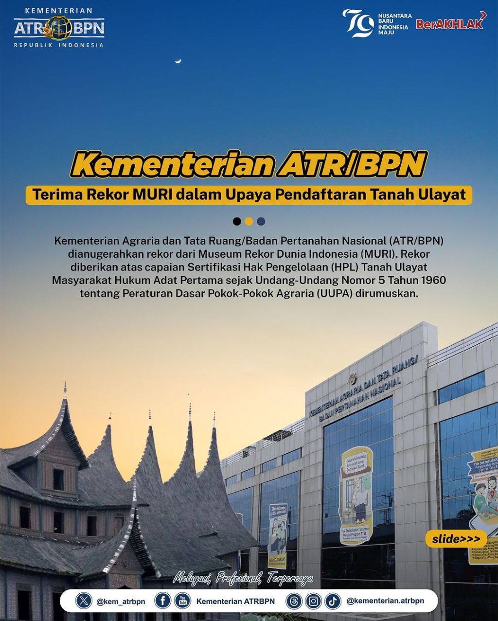 Kementerian ATR/BPN dianugerahkan rekor dari Museum Rekor Dunia Indonesia (MURI) atas Sertifikasi Hak Pengelolaan (HPL) Tanah Ulayat Masyarakat Hukum Adat Pertama sejak Undang-Undang Nomor 5 Tahun 1960 tentang Peraturan Dasar Pokok-Pokok Agraria (UUPA) dirumuskan.
