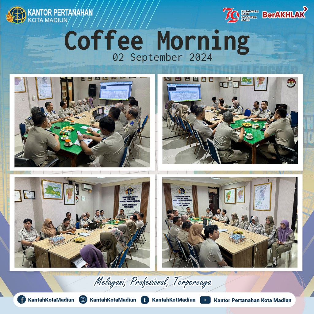 Halo #SobATRBPN, Hari ini Senin (02/09/2024) mengawali awal Bulan September Kantor Pertanahan Kota Madiun melaksanakan Coffee Morning sekaligus Rapat Koordinasi. Pada Coffee Morning Kali ini Kantor Pertanahan Kota Madiun melakukan evaluasi kegiatan sepekan sebelumnya dan rencana kegiatan yang akan dilaksanakan dalam pekan depan.