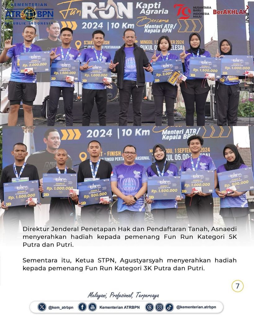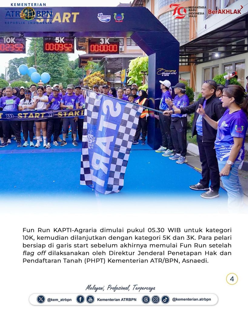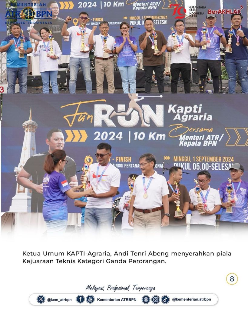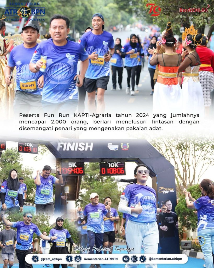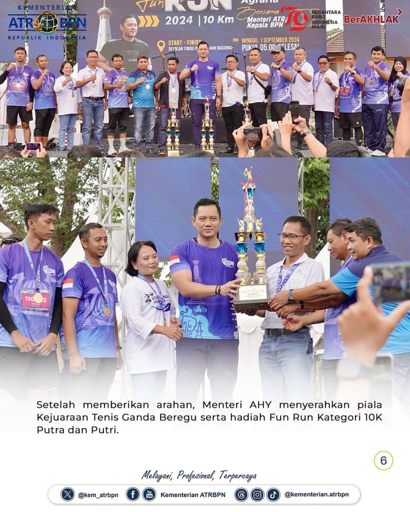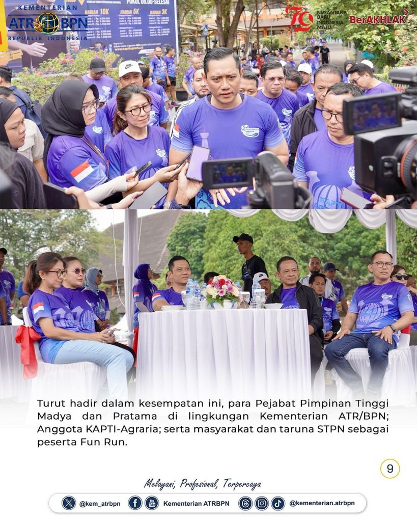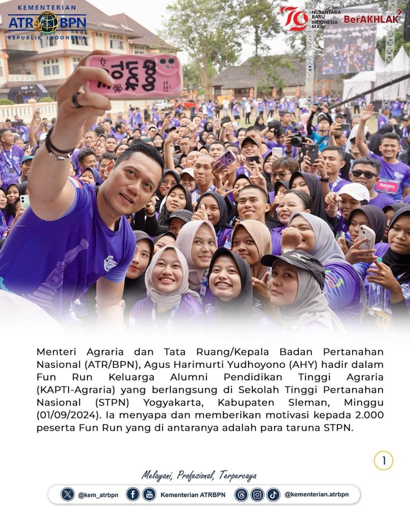 Menteri Agraria dan Tata Ruang/Kepala Badan Pertanahan Nasional (ATR/BPN), Agus Harimurti Yudhoyono (AHY) hadir dalam Fun Run Keluarga Alumni Pendidikan Tinggi Agraria (KAPTI-Agraria) yang berlangsung di Sekolah Tinggi Pertanahan Nasional (STPN) Yogyakarta, Kabupaten Sleman, Minggu (01/09/2024). Ia menyapa peserta sekaligus memberikan motivasi kepada taruna STPN yang mengikuti Fun Run.