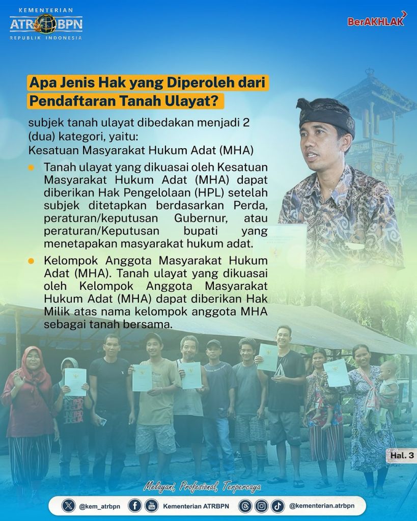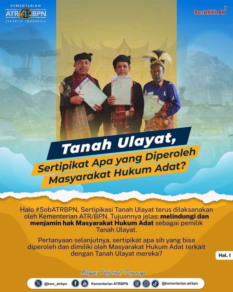 Kementerian ATR/BPN terus berkomitmen mengakselerasi pendaftaran tanah di seluruh penjuru Indonesia, tak terkecuali tanah Masyarakat Hukum Adat sebagai pemilik Tanah Ulayat.