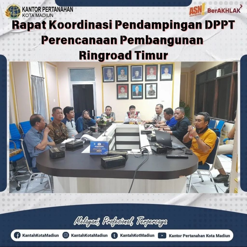 Halo #SobATRBPN bertempat di Kantor Dinas Pekerjaan Umum dan Perumahan Rakyat Kota Madiun, Kantor Pertanahan Kota Madiun dalam hal ini diwakili oleh Seksi Pengadaan Tanah dan Pengembangan Pertanahan Melaksanakan Rapat Koordinasi Pendampingan DPPT Kantor Pertanahan Kota Madiun dengan Dinas Pekerjaan Umum dan Perumahan Rakyat Kota Madiun tentang Perencanaan Pembangunan Ringroad Timur. Turut hadir dalam kegiatan ini Kepala Seksi Pengadaan Tanah dan Pengembangan (Bapak Geger Teguh Juwono) beserta tim dan plt Kepala Seksi Pengendalian dan Penanganan Sengketa (Bapak Sunardi).
