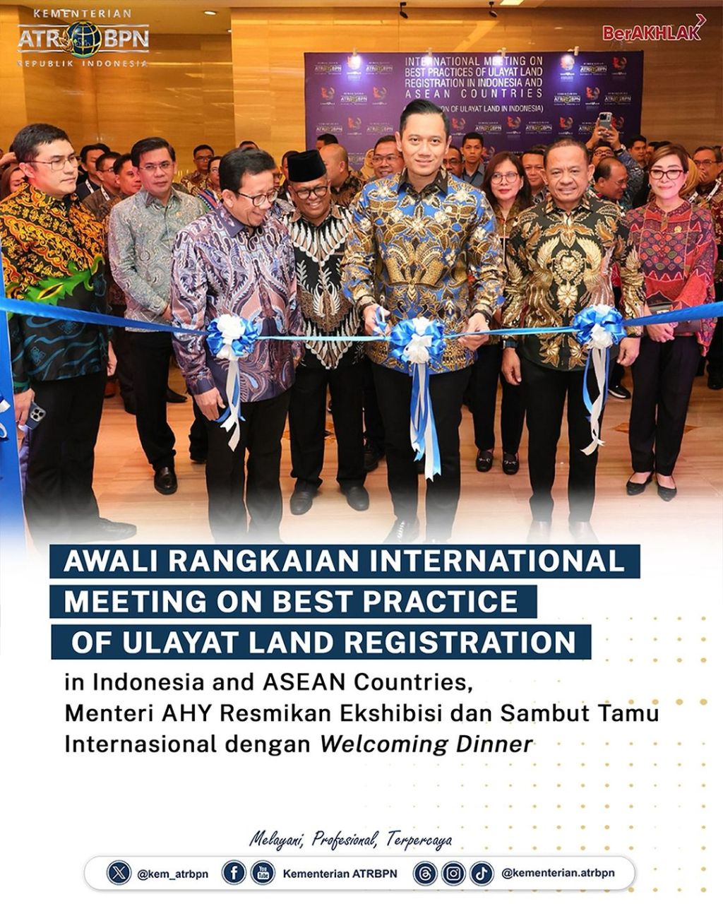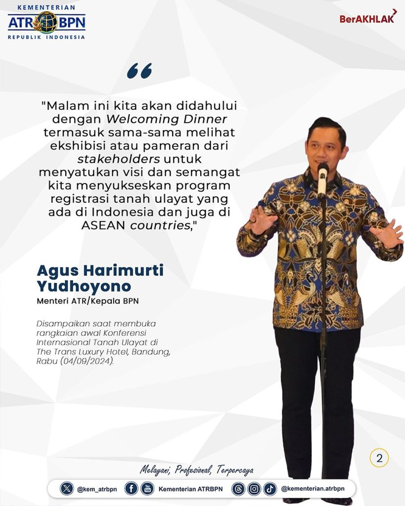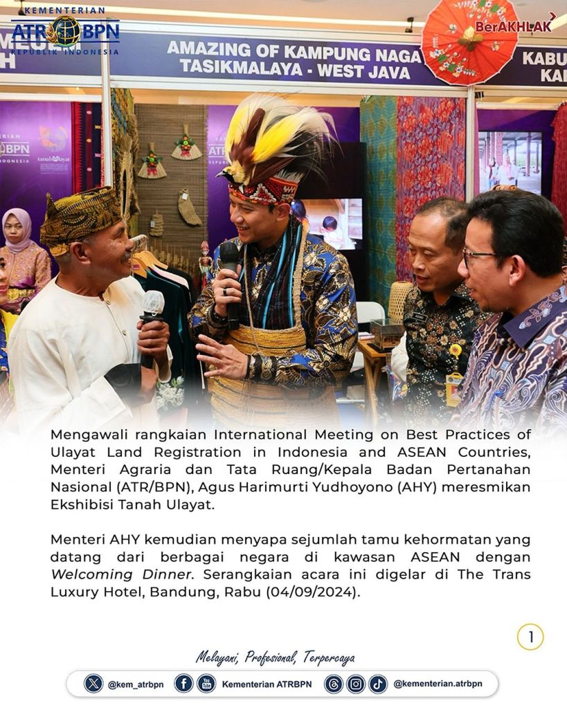 Mengawali rangkaian International Meeting on Best Practices of Ulayat Land Registration in Indonesia and ASEAN Countries, Menteri Agraria dan Tata Ruang/Kepala Badan Pertanahan Nasional (ATR/BPN), Agus Harimurti Yudhoyono (AHY) meresmikan Ekshibisi Tanah Ulayat yang digelar di The Trans Luxury Hotel, Bandung, Rabu (04/09/2024).