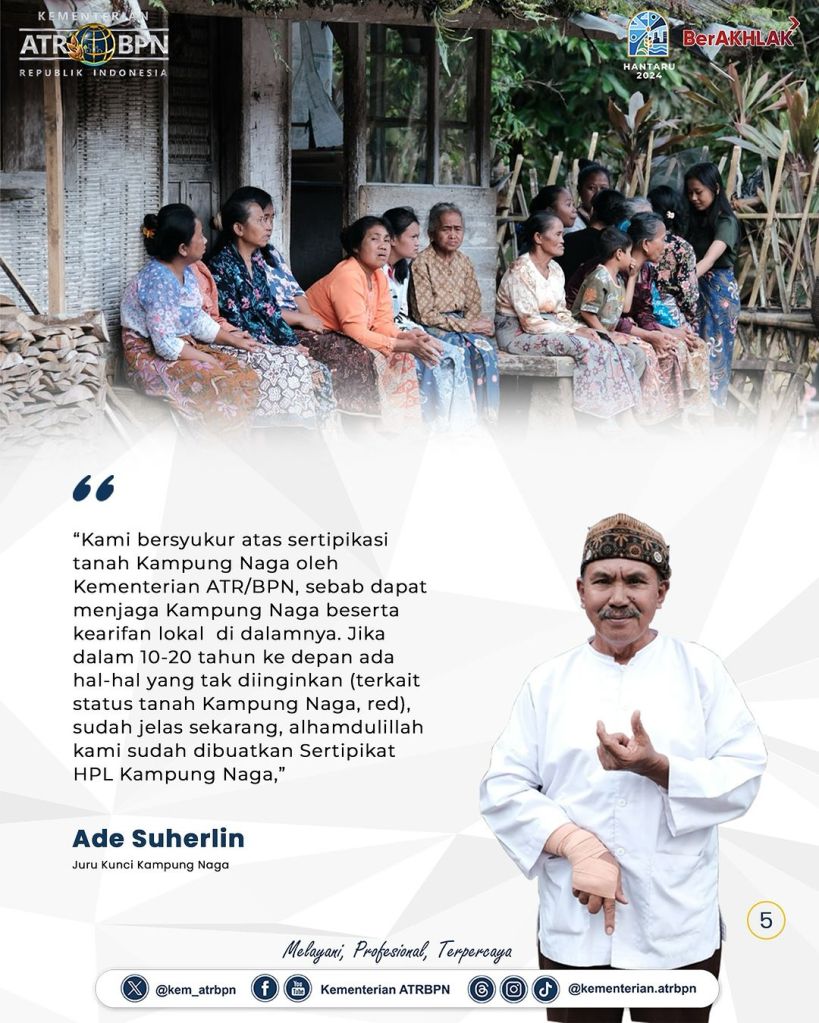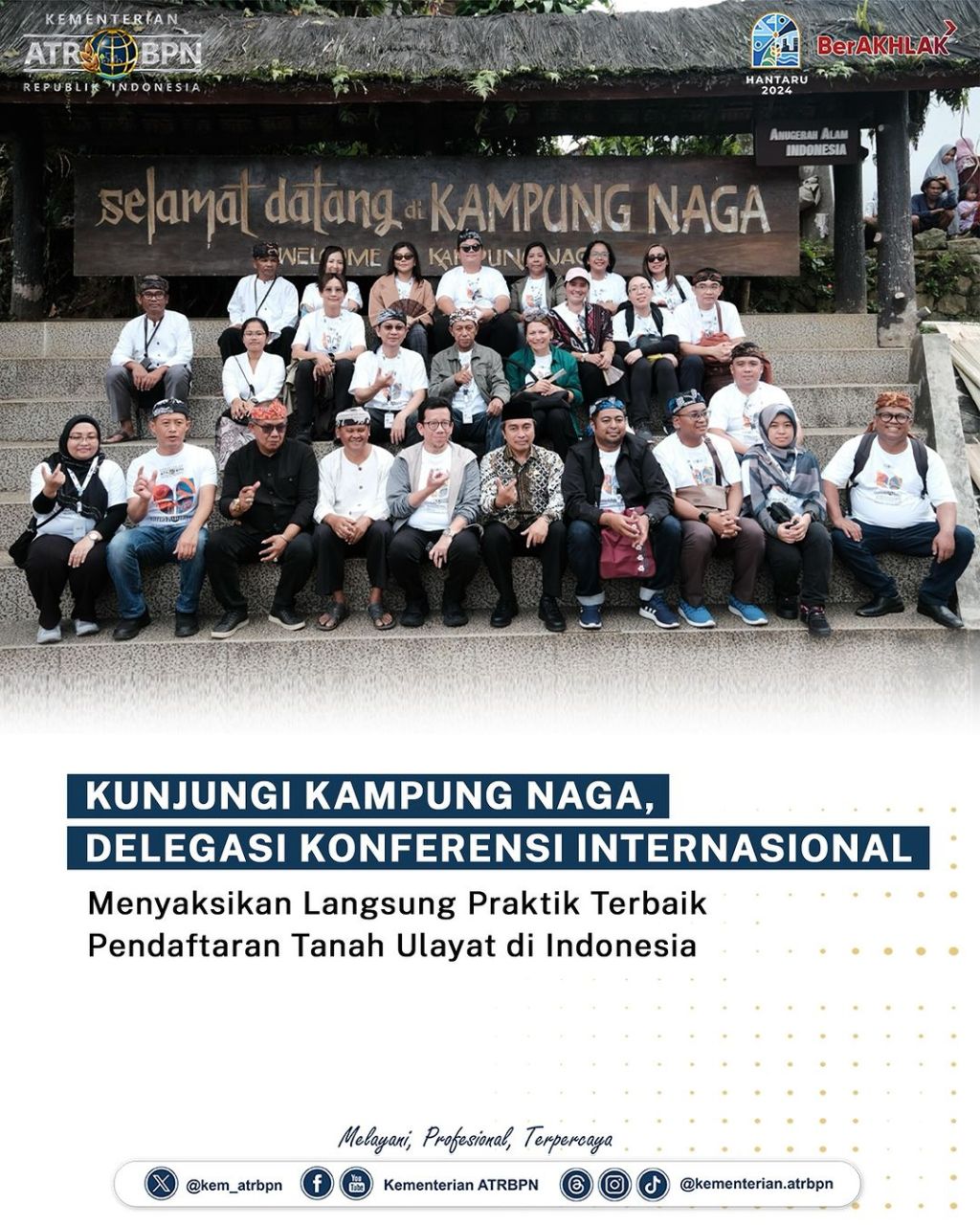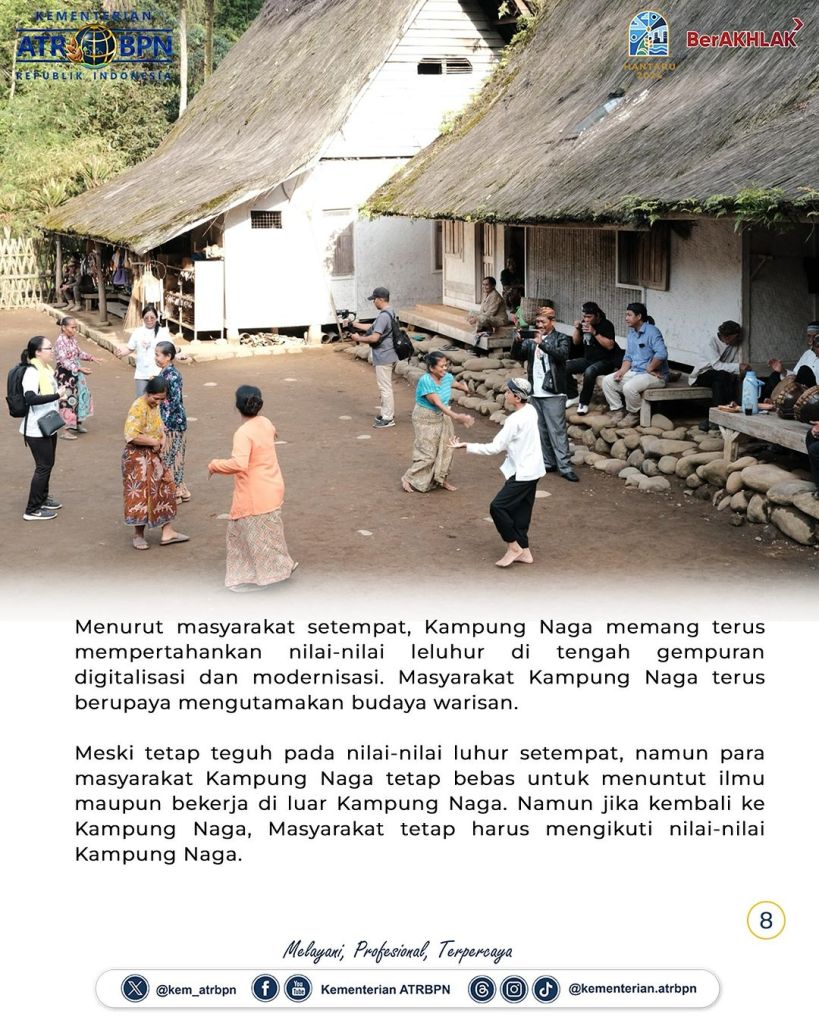 Peserta dan delegasi international dari Meeting on Best Practices of Ulayat Land Registration in Indonesia and ASEAN Countries yang diselenggarakan oleh Kementerian Agraria dan Tata Ruang/Badan Pertanahan Nasional (ATR/BPN) melakukan site visit ke Kampung Naga, Kabupaten Tasikmalaya, Provinsi Jawa Barat pada Jumat (06/09/2024). Kehadiran mereka disambut secara hangat oleh masyarakat serta dimanjakan oleh bentang alam Kampung Naga yang begitu sejuk dan asri.