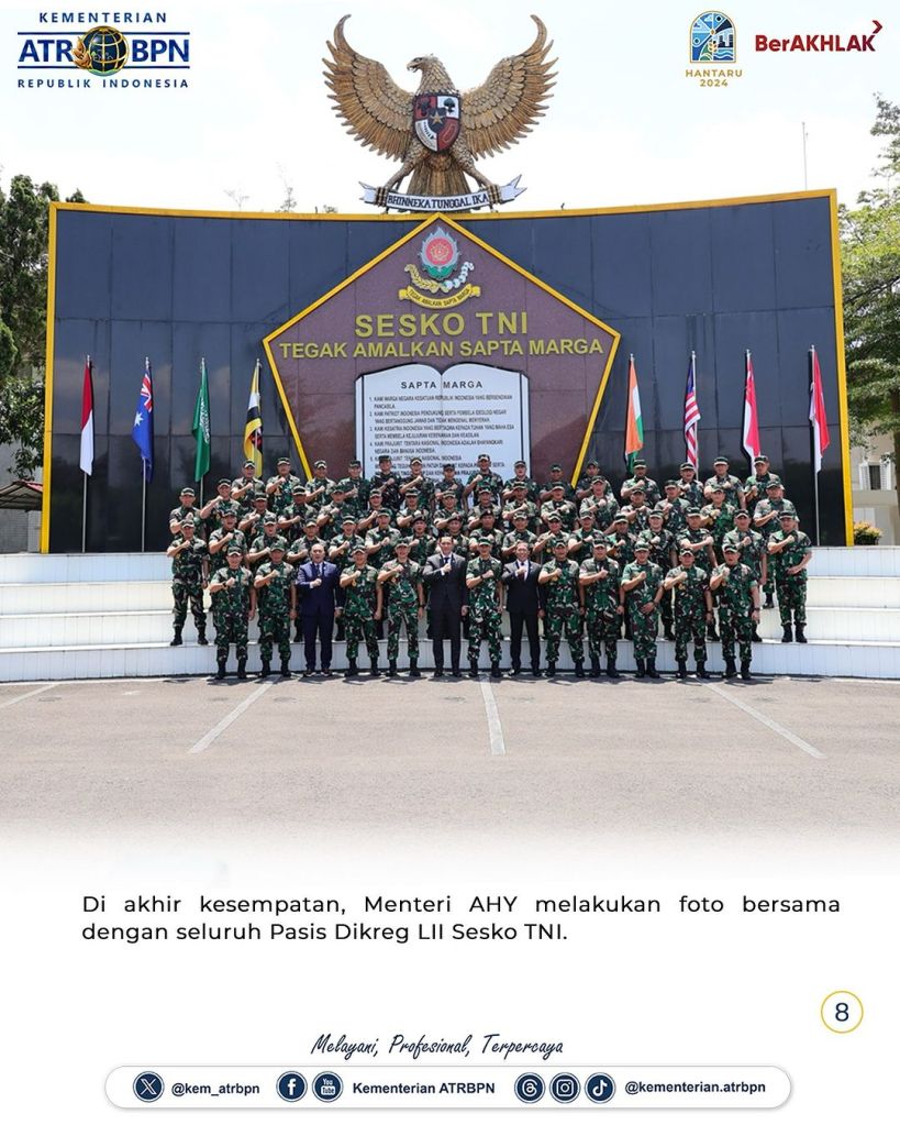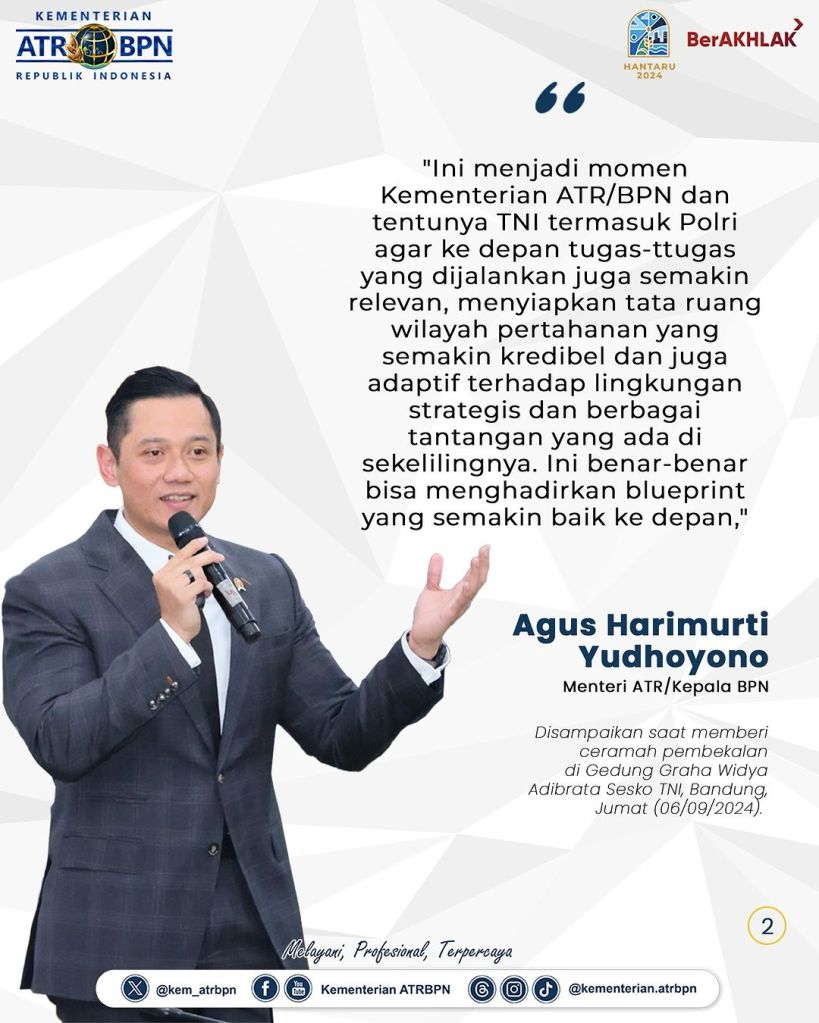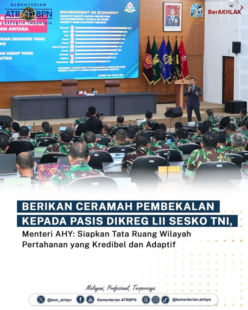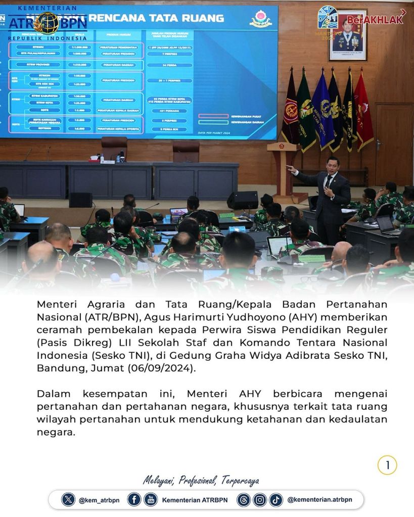 Menteri Agraria dan Tata Ruang/Kepala Badan Pertanahan Nasional (ATR/BPN), Agus Harimurti Yudhoyono (AHY) memberikan ceramah pembekalan kepada Pasis Dikreg LII Sesko TNI, di Gedung Graha Widya Adibrata Sesko TNI, Bandung, Jumat (06/09/2024). Dalam kesempatan ini, ia berbicara mengenai pertanahan dan pertahanan negara, khususnya terkait tata ruang wilayah pertanahan untuk mendukung ketahanan dan kedaulatan negara.