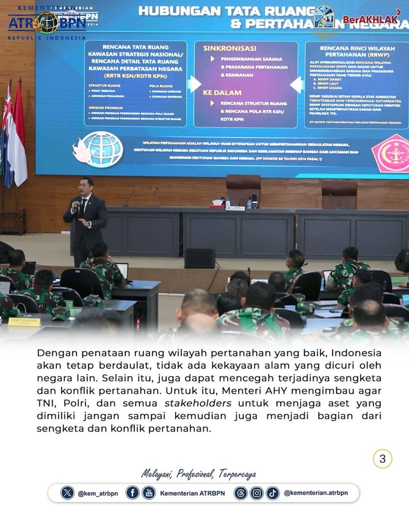 “Ini menjadi momen Kementerian ATR/BPN dan tentunya TNI termasuk Polri agar ke depan tugas-tugas yang dijalankan juga semakin relevan, menyiapkan tata ruang wilayah pertahanan yang semakin kredibel dan juga adaptif terhadap lingkungan strategis dan berbagai tantangan yang ada di sekelilingnya. Ini benar-benar bisa menghadirkan blueprint yang semakin baik ke depan,” kata Menteri AHY.