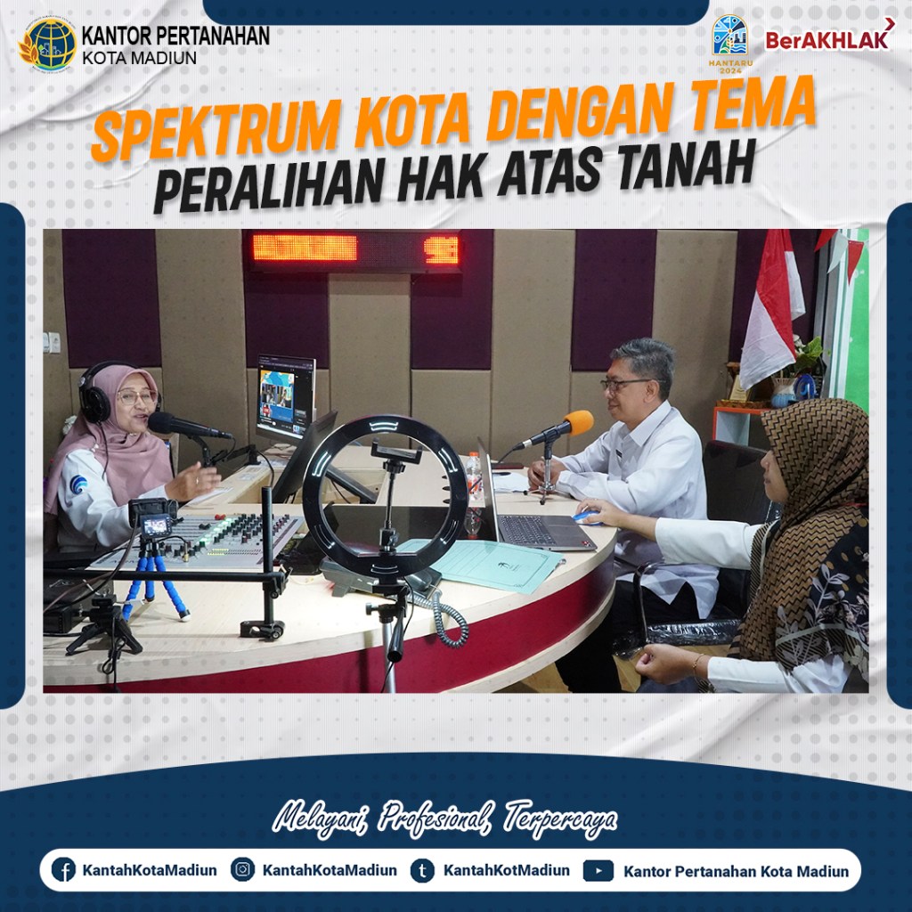 Halo #SobATRBPN, Hari ini Rabu (11/09/2024) Kantor Pertanahan Kota Madiun mengikuti Spektrum Kota Dinas Komunikasi dan Informatika Kota Madiun dengan Tema Proses peralihan hak atas tanah menjadi lebih mudah dan transparan bersama Kantor Pertanahan Kota Madiun. Pastikan hak kepemilikan tanah Anda terjaga dengan baik melalui layanan yang cepat, aman, dan terpercaya.