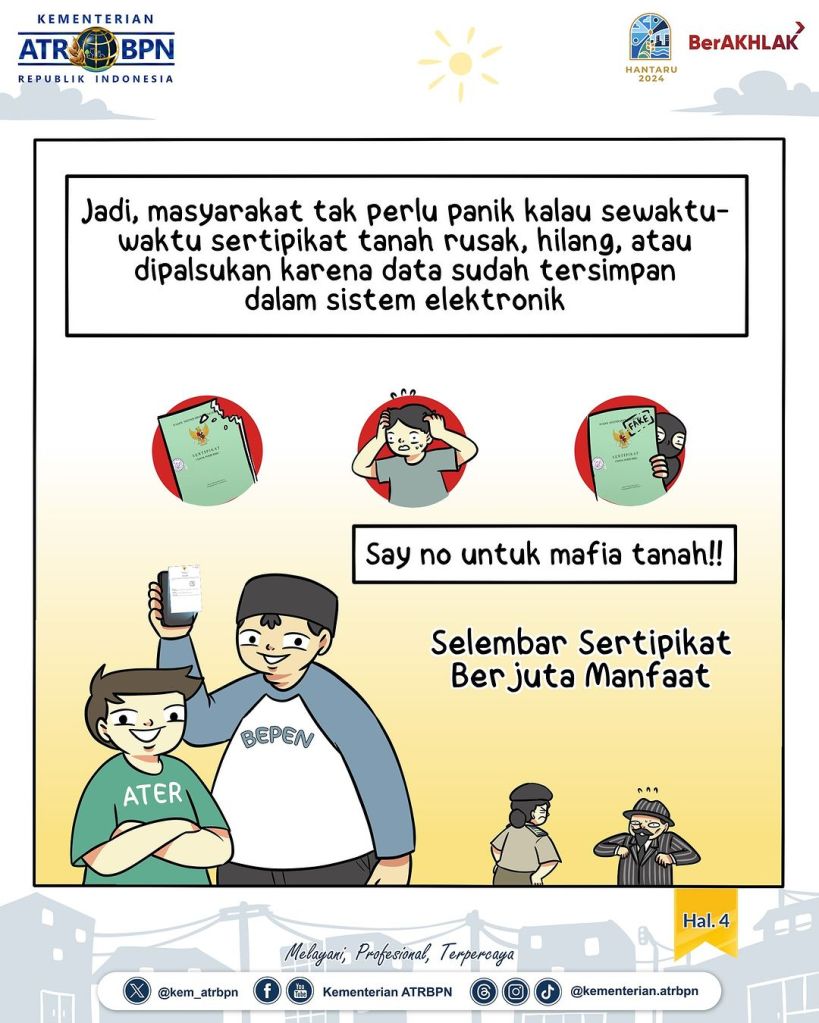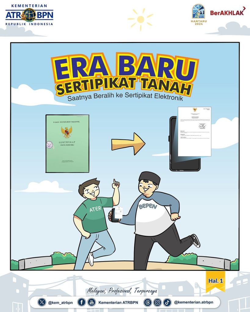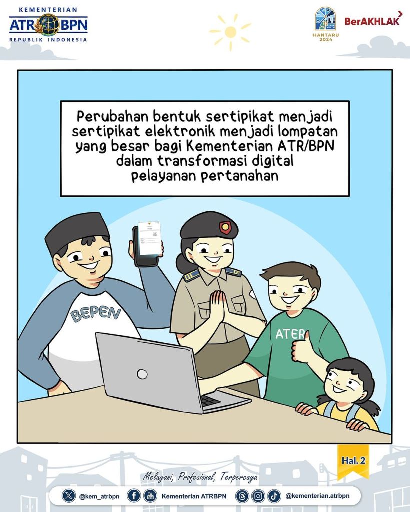 Kementerian ATR/BPN secara bertahap melakukan transformasi digital pelayanan pertanahan, termasuk penerapan sertipikat elektronik.