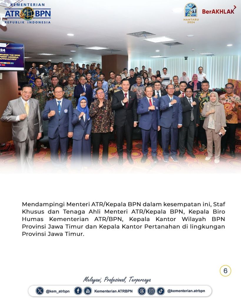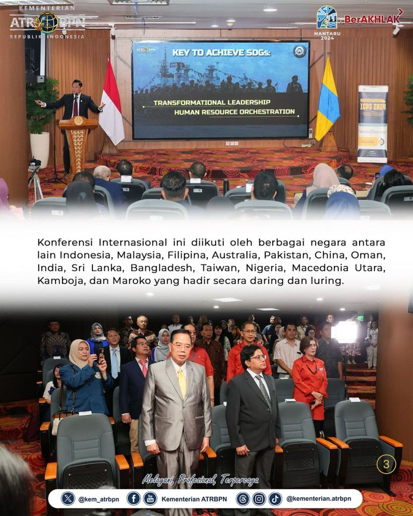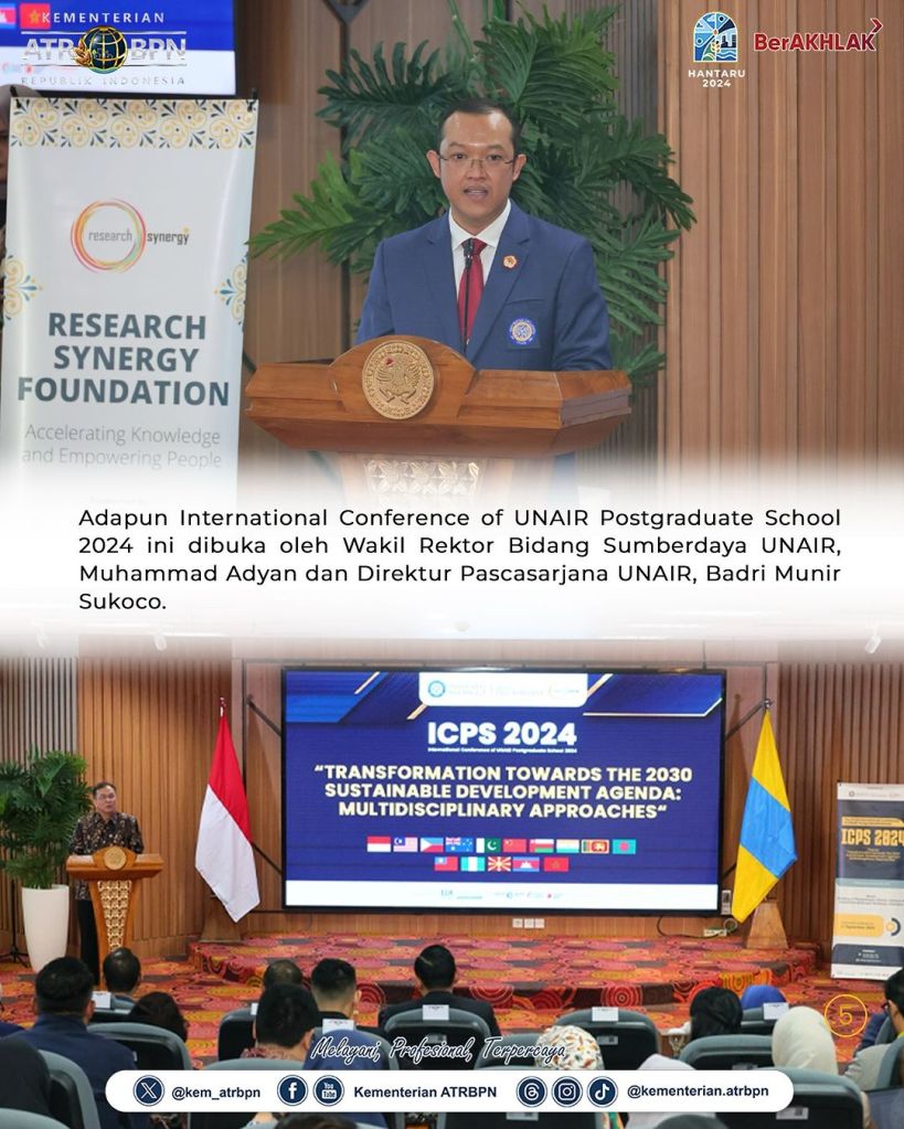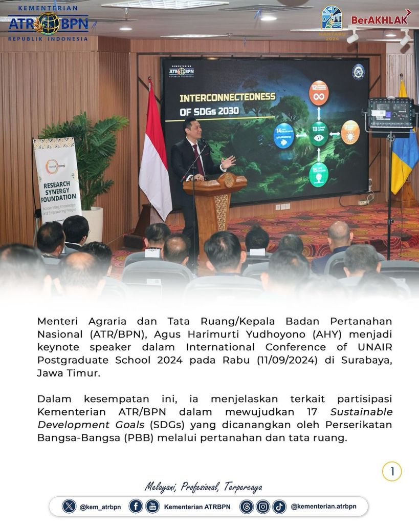 Menteri Agraria dan Tata Ruang/Kepala Badan Pertanahan Nasional (ATR/BPN), Agus Harimurti Yudhoyono (AHY) menjadi keynote speaker dalam International Conference of UNAIR Postgraduate School 2024 pada Rabu (11/09/2024) di Surabaya, Jawa Timur. Dalam kesempatan ini, ia menjelaskan terkait partisipasi Kementerian ATR/BPN dalam mewujudkan 17 Sustainable Development Goals (SDGs) yang dicanangkan oleh Perserikatan Bangsa-Bangsa (PBB)