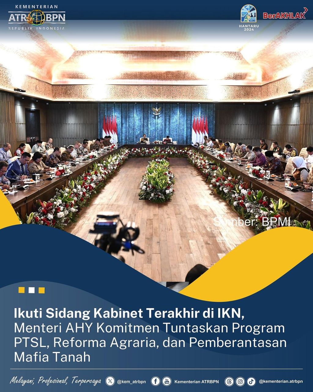 Penegasan ini disampaikan Menteri AHY usai mengikuti Sidang Kabinet Paripurna terakhir yang berlangsung di Istana Garuda, Ibu Kota Nusantara (IKN), Provinsi Kalimantan Timur, Jumat (13/09/2024).