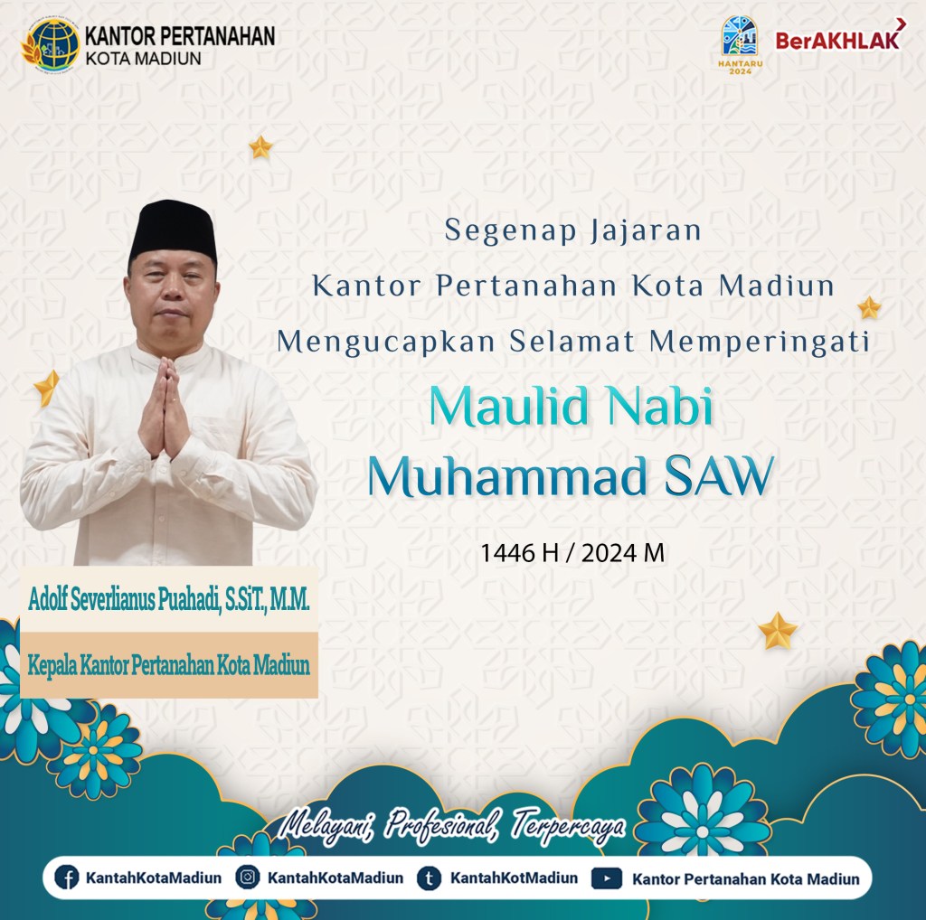 Segenap jajaran Kantor Pertanahan Kota Madiun mengucapkan Selamat Memperingati Maulid Nabi Muhammad ﷺ.